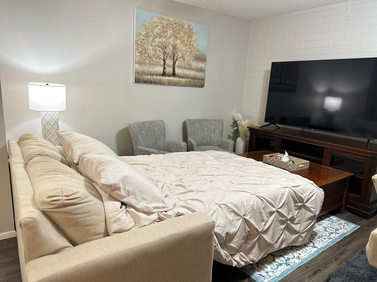 Tervetuloa 5 tähden hotelliimme, jossa on keittiö! Studiohuoneistomme on tilava ja yhtä suuri kuin monet yhden makuuhuoneen tilat. Se on lähellä Spring Training -stadionia, golfia, moottoritietä ja ravintoloita. Tulet ihastumaan hiljaiseen naapurustoon, kaikkiin uusiin kalusteisiin, keskeiseen sijaintiin. Toivotamme tervetulleiksi pariskunnat, yksin matkustavat seikkailijat, liikematkailijat ja perheet (lasten kanssa). Meillä on king-vuode, ulosvedettävä sohva ja rullasänky. Majoituksen hinta sisältää tuoreen kotitekoisen täysjyväleipän ja hilloa!
