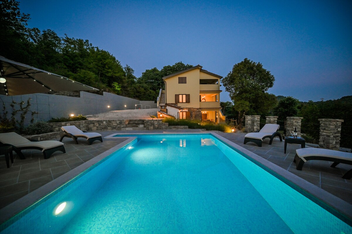Tutustu Villa Mochiin Pićanissa, ylellisessä 2-kerroksisessa huvilassa, jossa yhdistyvät modernia eleganssia ja rauhallista luontoa. 205 neliömetrin sisätiloissa on 4 tyylikästä makuuhuonetta, joissa jokaisessa on tv, 6 kylpyhuonetta, kaksi ruokailutilaa ja täysin varustettu keittiö. Ulkopuolella voit nauttia yksityisestä 900 neliömetrin puutarhasta, jossa on koskematon uima-allas, moderni suihkulähde, solariumit, päivänvarjot ja varjostettu terassi, jolla on grilli. Rentoudu ilmastoinnin, ilmaisen WiFin, vauvansängyn ja turvallisen pysäköinnin ansiosta.