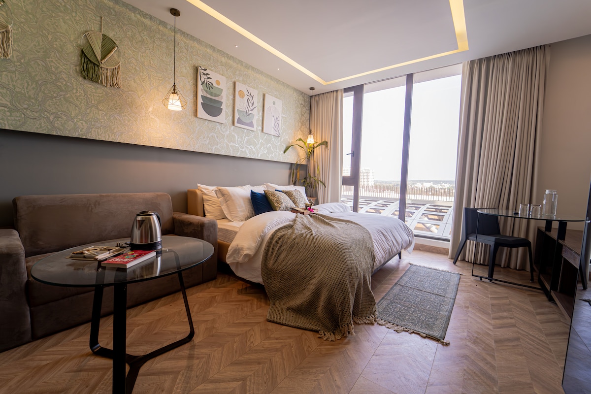 Tutustu vertaansa vailla olevaan mukavuuteen boheemisen tyylikkÀÀssĂ€ yhden makuuhuoneen sviitissĂ€mme Gurgaonissa. Nauti viihtyisĂ€stĂ€ oleskelutilasta, hyvin varustetusta keittiöstĂ€, eloisasta makuuhuoneesta, modernista kylpyhuoneesta ja parvekkeesta, jolta on upeat nĂ€kymĂ€t. TyylikĂ€s oleskelutila, jossa on kirjoja, lautapelejĂ€, kasveja ja boho chic -sisustus. Uppoudu ylellisyyteen tĂ€ydellĂ€ varavoimalla ja ympĂ€rivuorokautisella turvallisuudella. Mukavuutesi on meille ensisijaista â koe majoittuminen, jossa jokainen yksityiskohta on suunniteltu iloksesi. Varaa nyt ja nauti ainutlaatuisesta yhdistelmĂ€stĂ€ hienostuneisuutta ja lĂ€mpöÀ!