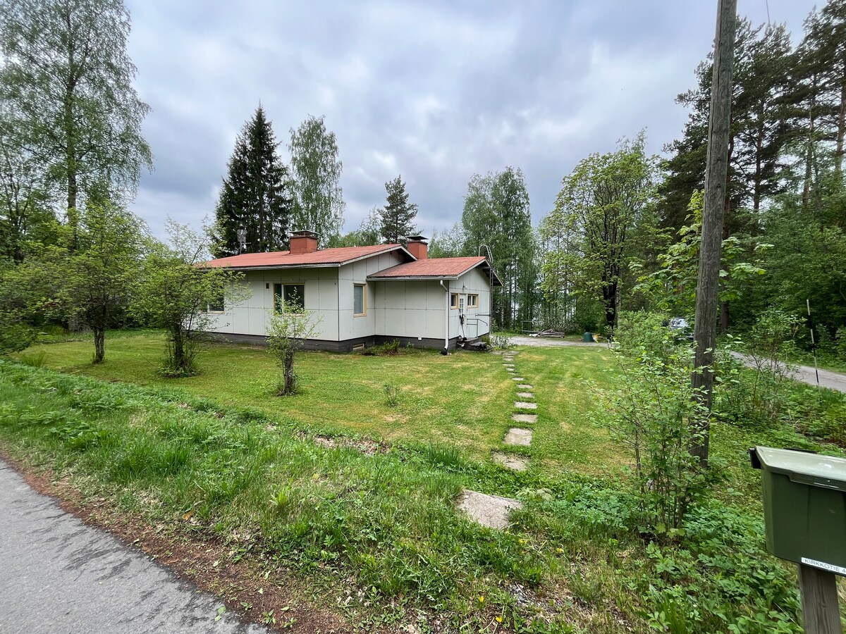 Welcome to our 100m2 Vintage Cottage, crafted in 1964. Ideal for families, it offers 2 bedrooms, a cozy living room with a fireplace, and a well-equipped kitchen. Enjoy the sauna with wood-burning stove and relax in the charming yard with a children's playground nearby. Your perfect family retreat! You can take trips on the lake with rowing boat! Boat is located 160m from the house, nearest public beach 250m. See additional pictures how to access the boat and the beach. Rent includes 2 bikes.