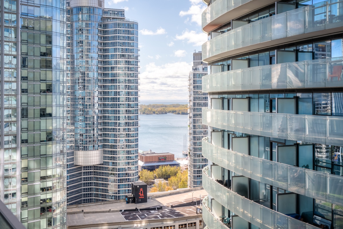 Upea valoisa yhden makuuhuoneen huoneisto, josta on näkymä Toronton keskustan ytimeen. Valtavista ikkunoista on upeat näkymät Rogers Centreen, CN Toweriin, Steamwhistle Roundhouseen ja Metro Toronto Convention Centreen. Sijaitsee vain muutaman askeleen päässä Scotiabank Centre -keskuksesta, Rogers Centre -keskuksesta, Ripley's Aquarium -akvaariosta ja kaikista keskustan ravintoloista ja nähtävyyksistä; muutaman minuutin kävelymatkan päässä mistä tahansa rakennuksesta rahoituskeskuksessa ja aivan rantakadulla. Muutaman askeleen päässä Union Stationista, josta pääsee nopeasti metroon.