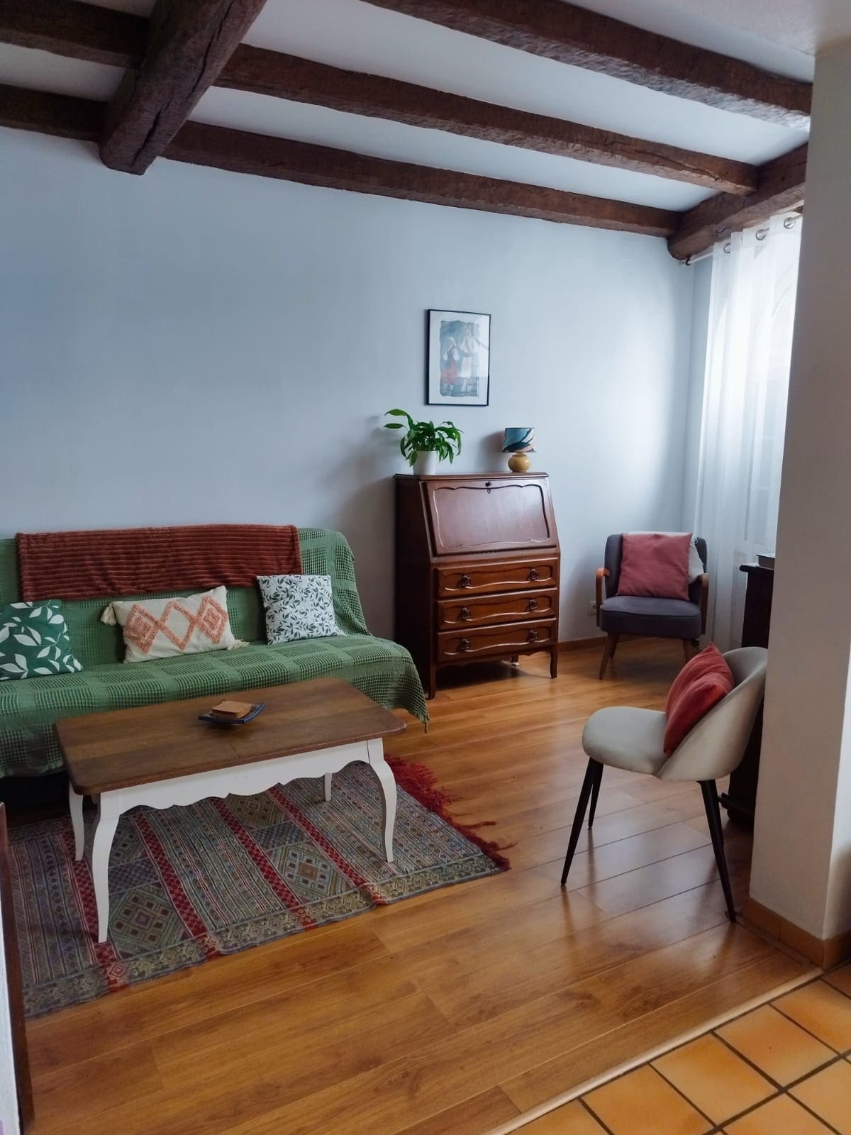 Appartement type duplex de 30m2 sur deux niveaux, type T1, chez l'habitant, avec entrée privative: * rez de chaussée: cuisine tout équipée, petit espace de repas, salle de douche, toilettes * 1er étage: lit queen size 160x190, rangements, bureau, TV, fauteuils, climatisation * une petite place de parking devant la maison (une trop grosse voiture ou un van ne rentrent pas) * linge fourni: draps + serviettes de toilette + torchon + essuie main + tapis de bain ATTENTION : PAS DE WIFI
