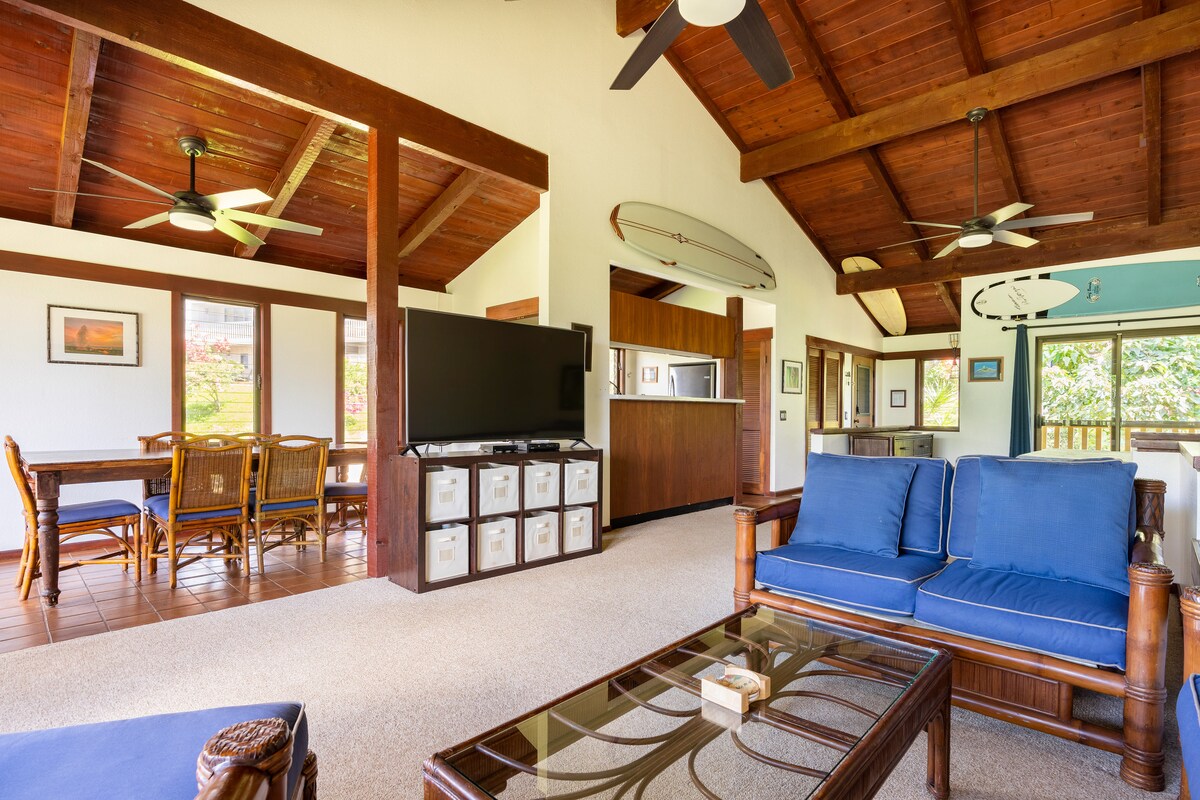 Nyt ilmastoitu, korkea, valoisa, bungalotyylinen rivitalo Kauain halutulla pohjoisrannikolla. Nauti rauhallisesta ja rentouttavasta lanai-kuistista, jota ympäröivät saaren rehevät viheralueet, tai uida naapuruston uima-altaassa. Avoin asuintila ja kaksi makuuhuonetta, joissa on oma kylpyhuone ja lanais. Kirjaimellisesti muutaman askeleen päässä auringonnousun näkymistä ja Wyllie Beachin polun alusta. Pyöräile Queens Bathiin, auringonlaskun happy hours -tunteihin, ravintoloihin, ostoksille ja joogaan. Lyhyt ajomatka Hanalei Bayhin, Anini Beachille, Tunnels Beachille ja muihin North Shoren helmiin.
