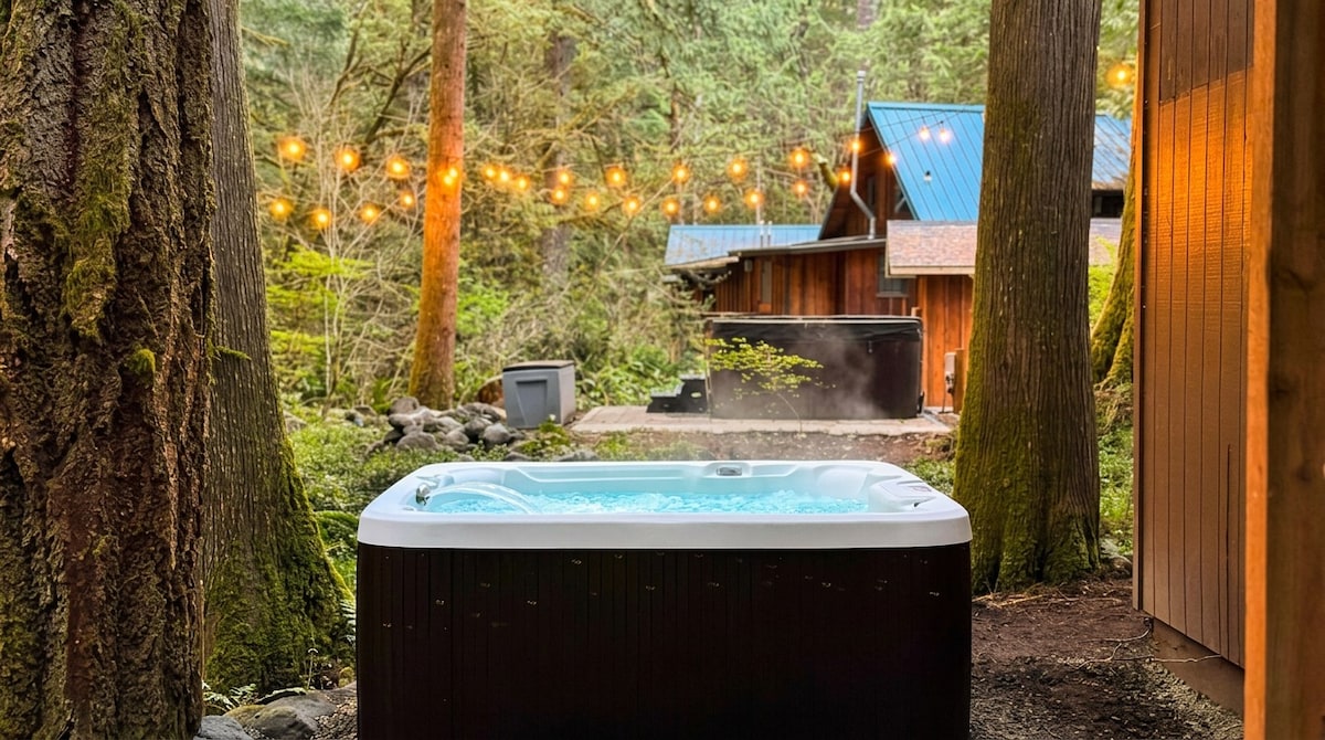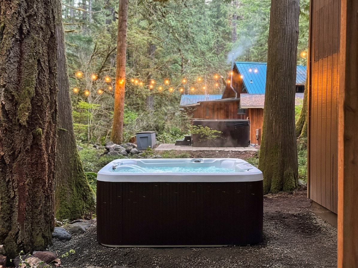 Two cabins, two hot tubs, and one creekside compound. Nestled against a forest amongst the soothing soundtrack of the nearby creek. Sleeps 15 across 7 bedrooms, each cabin with its own kitchen, living room, and hot tub tucked in the trees. Walk down for a cold plunge, gather around the fire pit after dark, or settle into the hot tub and let the mountain do its thing. Parking for 8 cars. Dogs welcome, golf and fishing minutes away, trails even closer. Your whole group, your own little village.