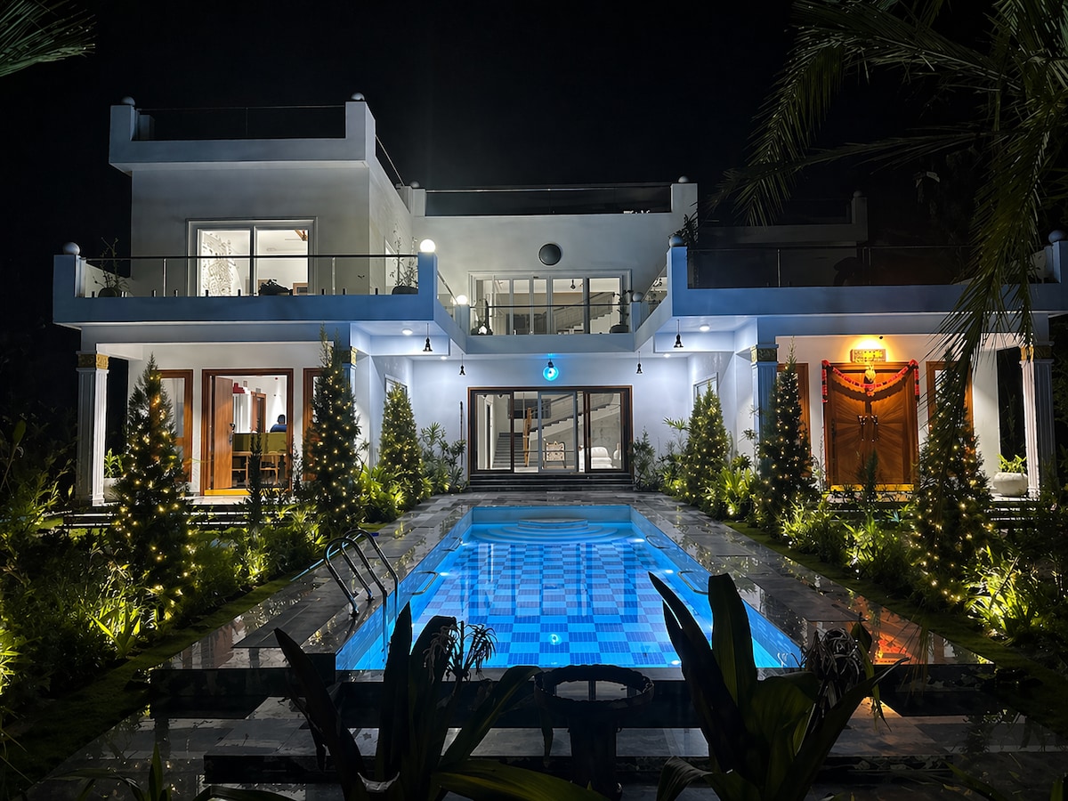 Tervetuloa upouuteen upeaan 5-BHK: n ylelliseen maalaistaloomme, joka on luonnossa sijaitseva taiteellinen paratiisi. Tässä kauniisti suunnitellussa lomakohteessa yhdistyvät modernia eleganssia ja maalaistyylistä viehätysvoimaa. Tilavat oleskelutilat, jotka on koristeltu taiteellisilla yksityiskohdilla, ja suuret ikkunat, jotka kutsuvat ulkoilmaan. Nauti erityisestä leikkialueestamme, joka on täydellinen perheen hauskanpitoon, kun taas rauhallinen ympäristö tarjoaa rauhaa ja rentoutumista. Rentoudu ulkoterassilla ja nauti henkeäsalpaavista näkymistä auringonnousun /-laskun aikaan tai tähtien alla.