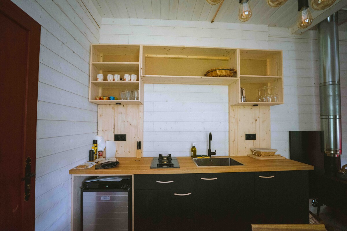 Viihtyisä eristetty mökki takalla