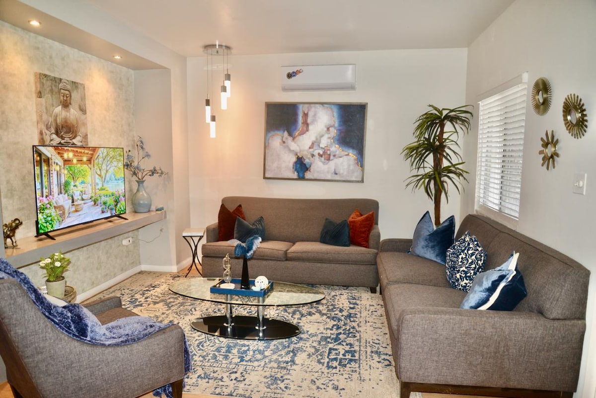 Tervetuloa kotiimme, nauttikaa: – 75" 4K Roku TV, jossa Netflix, Prime, Hulu, Disney+ – 1 queen-size-vuode ja 1 vuodesohva (queen-size) – Ylellinen sadesuihku ja moderni kylpyhuone - Täysin varusteltu, varusteltu ja puhdas keittiö - pesukoneen kuivausrumpu - Erityinen, nopea ja turvallinen wifi (300 Mbit/s) - Työtila - Itsepalvelusisäänkirjautuminen - tilavat kaapit - höyrystin, hiustenkuivaaja, puhdistusaineet - himmennettävät lämpimät valot luovat tunnelmaa – Tason 2 EV-laturi. - Kätevä sijainti lähellä ECRMC:tä ja kauppoja.