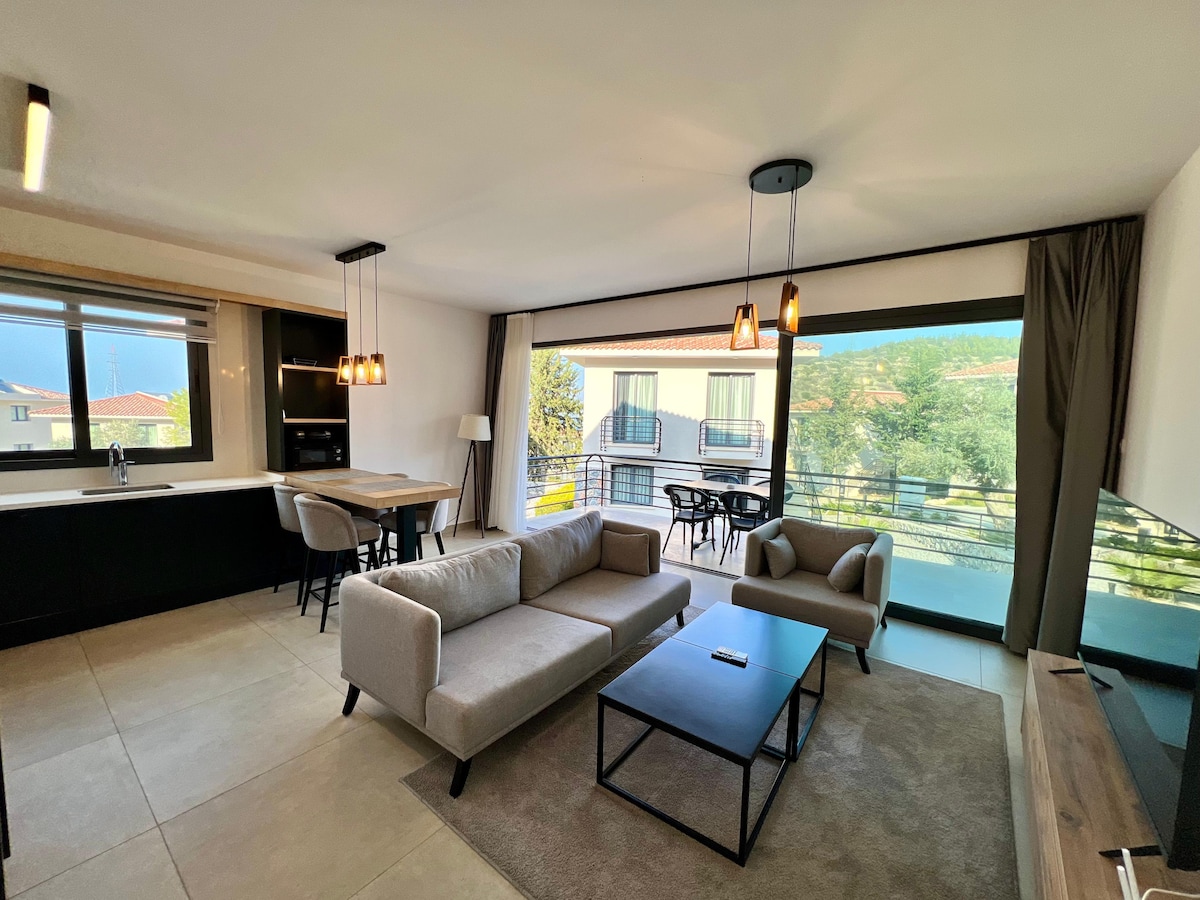 A place to breathe. Nestled in the mountains of Northern Cyprus, a stylish home full of peace and light awaits you. Two cozy bedrooms with private bathrooms, a lovingly equipped kitchen, and a balcony where time seems to stand still. Start your day with birdsong, enjoy the pool, relax in the sauna, or work out in the gym – and reconnect with yourself. Welcome to your personal retreat in Illgaz.