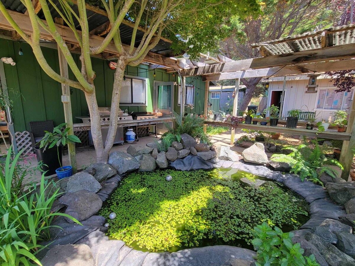 Nauti unelmien majoittumisesta kauniissa piilopaikassamme, joka on mailin päässä Glass Beachistä, Pudding Creek Beachistä ja Fort Braggin keskustasta! Mökki sijaitsee syrjäisellä tontilla, jossa on täysin yksityisyys, aidattu sisäänkäynti ja pysäköinti. Rentoudu ilmaisen viinin äärellä kuistilla ja nauti auringonlaskusta ja tähtikirkkaista öistä luonnonkauniista viljelysmaan ilmapiiristä. Sisällä on ihana olohuone, jossa on kattoikkuna, täysin varustettu keittiö, koskematonta luonnonkaivovettä, alasvedettävä vuodesohva, yksityinen makuuhuone, jossa on queen Dreamcloud -patja, indie-/taidekirjoja.