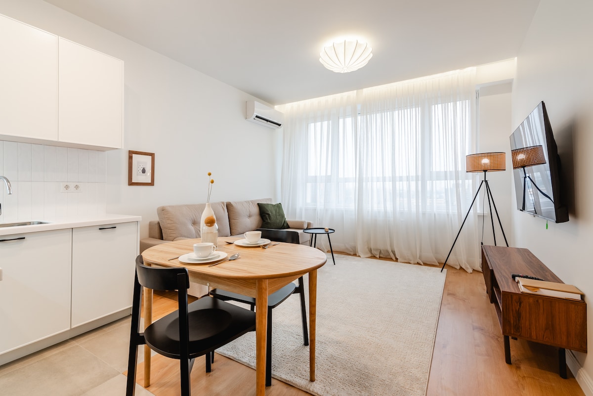 Our bright and cozy apartment is located in the heart of the city, offering stunning views of the sunset and the city skyline through wide windows. Within walking distance, you’ll find shopping malls, restaurants, and cafes. The largest mall in the city is just 10 minutes away by taxi, and a metro station is a 10-minute walk. Free public parking is available near the building. If you liked our apartment or haven’t decided whether to book yet, add it to your wishlist for easy access.