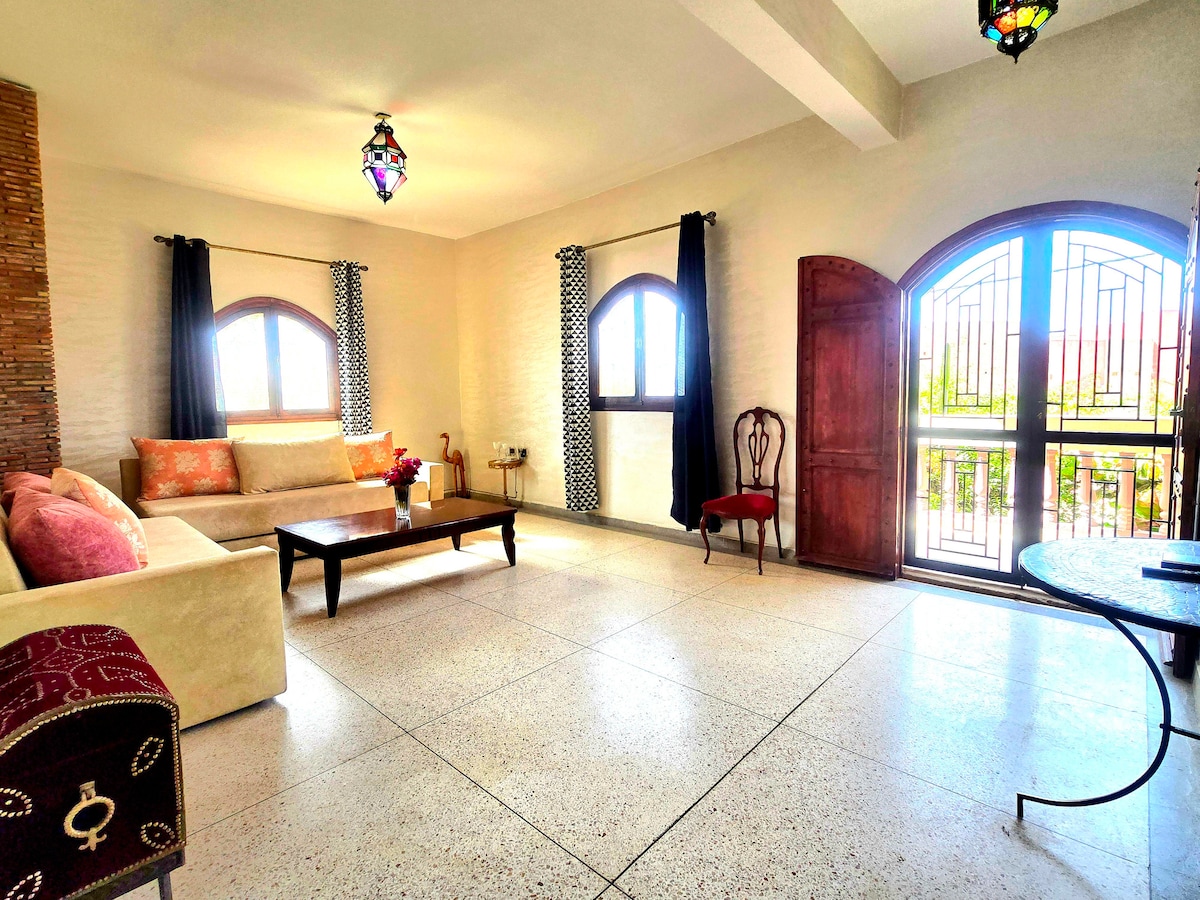 Erittäin kaunis 120 m2:n huvila 550 m2:n tontilla, jossa on 2 makuuhuonetta, 2 kylpyhuonetta, suuri suljettu puutarha ilman vastapäistä rakennusta, yksityinen uima-allas, 4*8 m suuri katettu terassi. Patio. Vieraat voivat nauttia täydellisestä varustelusta, keittiöstä, jossa on mikroaaltouuni, uuni, astianpesukone. Huvilassa on wifi, pesukone ja kaikki, mitä tarvitset täydelliseen lomaan. Sijaitsee turvallisessa Dyar Shemsi -kiinteistössä, jossa voit nauttia jaetusta pysäköinnistä, 300 m2:n yhteisestä uima-altaasta, kuntosalista jne.