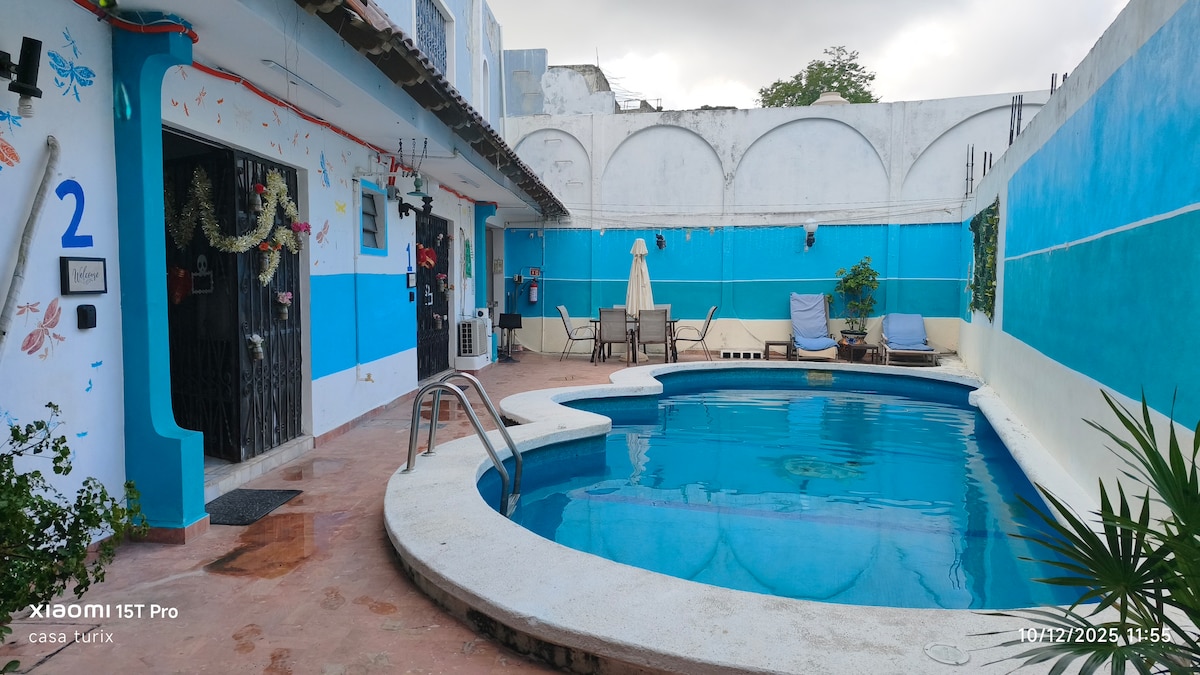 Viehättävä majoitus Cancúnin keskustassa. Pääsy majoituspaikkaan on talon takaoven kautta, ja saavut ylittämällä kiviäisen polun jaetulla uima-altaalla. Paikka on yksityinen ja sisältää täydellisen kylpyhuoneen ja keittiön, joka on ihanteellinen yksinkertaisten ruokien valmistamiseen tai ruoan jäähdyttämiseen. Muutaman metrin päässä on julkinen liikenne rannoille ja 5 minuutin päässä ADO-linja-autoasema, josta on reittejä lentokentälle ja muihin matkailukohteisiin.