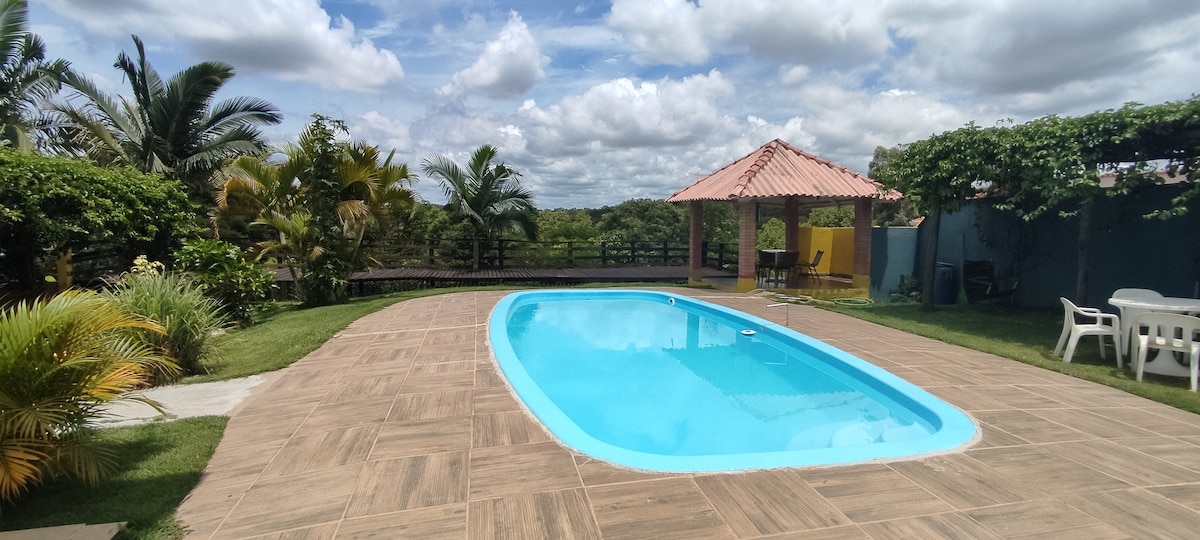 Kaunis maatila, paljon vehreyttä aidatussa yhteisössä, jossa on 24h-portinvartija. Yhteys luontoon mukavuudesta ja mukavuudesta tinkimättä! - 4 makuuhuonetta (mahtuu enintään 29 henkilöä) - keittiö varustettu kaikki välineet; - Teollisuuden liesi, liesi ja perinteiset uuni ja polttopuut; - grilli, - pakastin, - biljardipöytä, - riippumatto, - allas, - televisio, - katettu autotalli viidelle autolle, - leveä parveke, - pergolado, Kioski - Kansi - 1500 m². Yksinkertainen ja kohtuuhintainen koti!