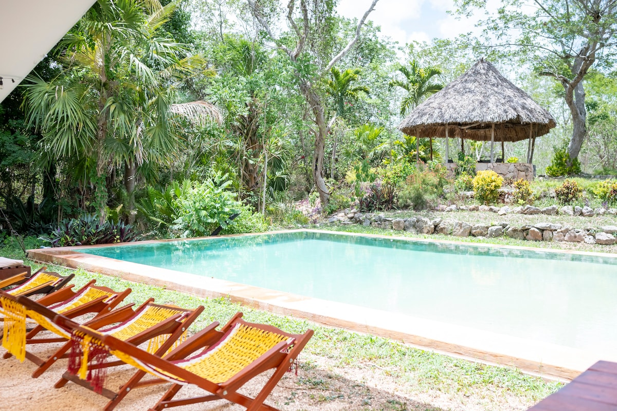 Nauti kahdesta mökistämme perheympäristössä, jossa voit kokea majoittumisen paikassa, joka yhdistää ihmiset toisiinsa ja ihastella luontoa. Olemme suunnitelleet kaiken perheille ja ystäville: tapahtuma-alue, grillausalue, leikkipaikka, uima-allas, kahluallas, jalkapallokenttä, meditatiopolut. Meillä on kaikki, jotta ryhmäsi viihtyy uskomattomasti. Sijaitsemme Cancúnin suuntaan, lähellä cenoteja ja Izamalia.