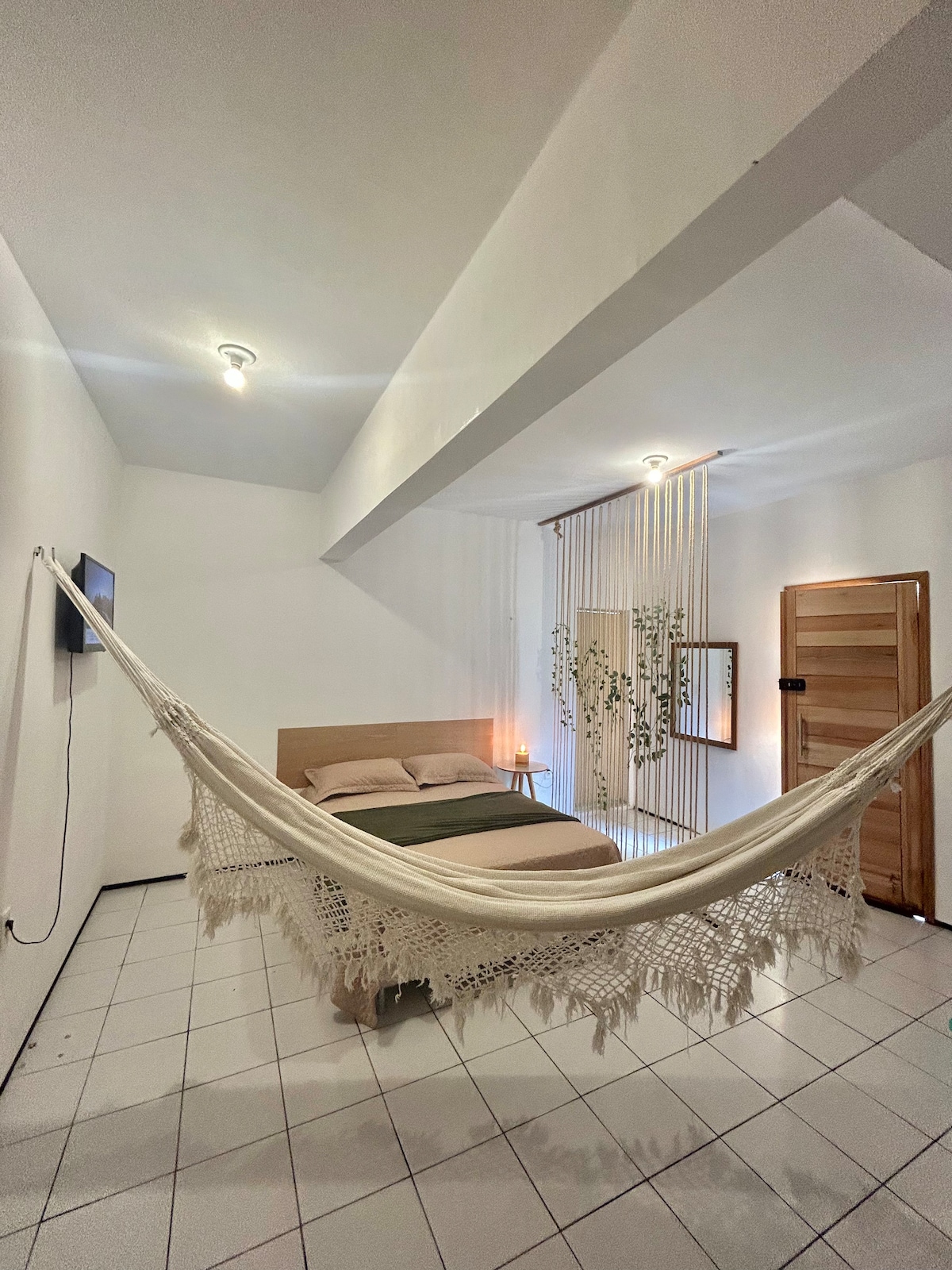 NO STUDIO: Ar condicionado 1 cama de casal Rede de dormir ( Para hóspedes extra) Espaço home office Wi-Fi grátis 1 Smart TV Roupeiro Roupas de cama e banho Cozinha completa ( fogão elétrico, microondas,frigobar, sanduicheira, liquidificador, Air fryer, sanduicheira) Pet friendly (1) Obs.: É obrigatório o envio de documento de identificação com foto válido de todos os hóspedes para acessar a acomodação.