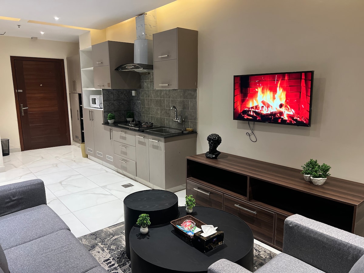 Tämä tyylikäs, minimalistinen ja ylellinen yksiö on viihtyisä ja taiteellinen paikka Gulbergin sydämessä. Nauti upeista näkymistä kaupunkiin ja päätielle, mukaan lukien Monalin siluetti ja hehkuvat yövalot. Tilava oleskelutila, jossa on täysin varustettu avoin keittiö, älytelevisio ja ilmainen parkkipaikka kellarissa, tekee siitä täydellisen pienille perheille, yksin matkustaville, ammattilaisille ja pitkiä majoittumisia varten. – Aikainen sisäänkirjautuminen / myöhäinen uloskirjautuminen saatavuuden mukaan, 1 000 PKR/tunti – Naimattomat parit eivät ole sallittuja – Kaikilla yli 18-vuotiailla pitää olla henkilötodistus.
