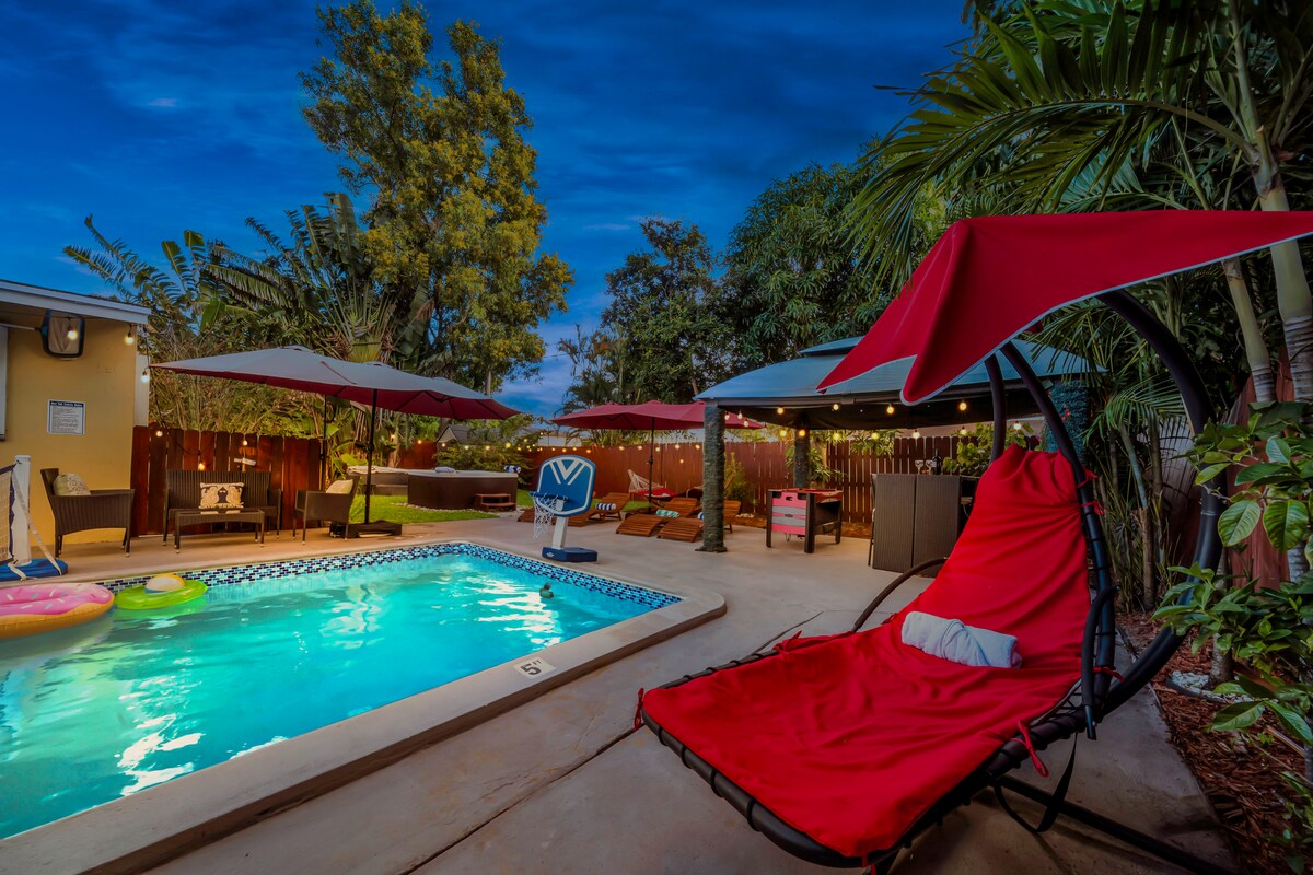 🌴 Rauhaa PBG:n/PGA:n sydämessä! ✨ Nauti ylellisestä mukavuudesta tässä tyylikkäässä yksikerroksisessa retriitissä lähellä koskemattomia 🏖️ rantoja, hienoja ravintoloita, ostosmahdollisuuksia ja maailmanluokan ⛳ golfia. Astu yksityiseen trooppiset keitaaseesi, 🌺 jossa on lämmitetty uima-allas, rauhoittava kylpylä, tyylikkäät lepotuolit, grilli ja tyylikäs Tiki-huvimajabaari, 🍹 jota ympäröivät huojuvat palmut, banaanipuut ja hibiskukset. Sisällä: valoisa, avoin ja tahraton 135 neliömetriä. King primary -sviitissä on ylellinen kylpyhuone 🛏️. Nauti täydellisistä mukavuuksista. Rauhallinen lomakeskustyyppinen pakopaikka