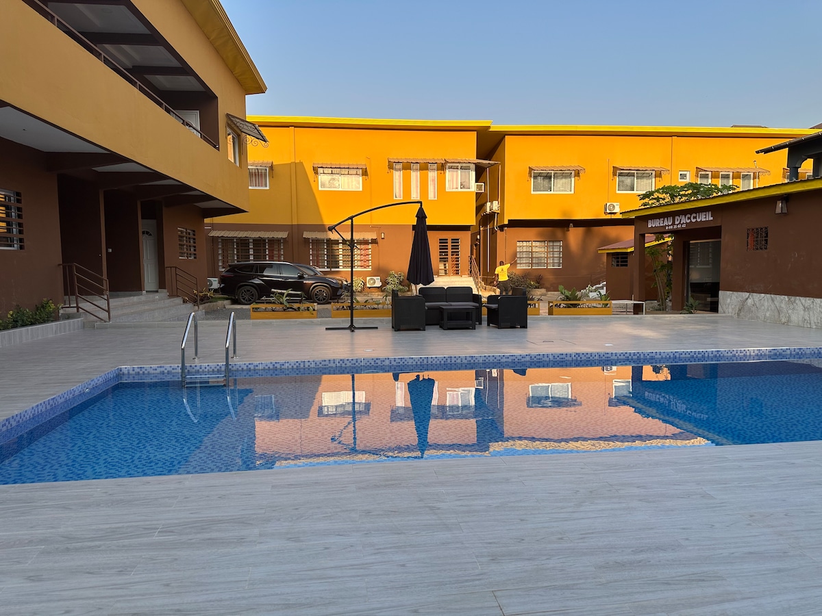 Turvallinen asuinkompleksi, josta voit nauttia yksin tai koko perheen kanssa. Tämä luksushuoneisto sijaitsee Kipe, Conakryn keskustassa, vain muutaman minuutin päässä suosituista paikallisista nähtävyyksistä, kuten Prima Center, Lycee Francais ja Yhdysvaltain Guinean suurlähetystö. Noin 15 minuuttia lentokentältä. Nauti ensiluokkaisista mukavuuksistamme, kuten ympärivuorokautisesta WiFi-yhteydestä ja sähköstä, pesukoneesta ja kuivausrummusta tiloissa, kun rentoudut missä tahansa tyylikkäästi sisustetuissa huoneissamme, joissa on viihdejärjestelmä, joka tekee majoittumisestasi ikimuistoisen.