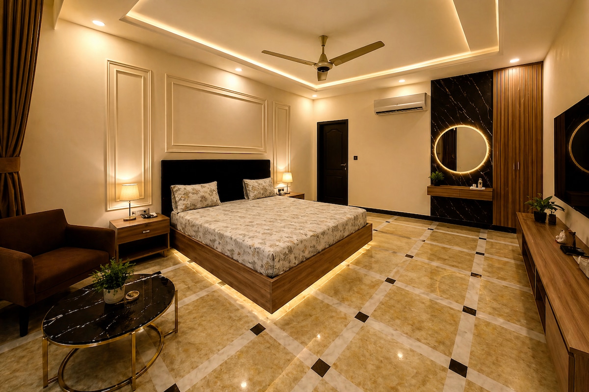 Welcome to Sapphire Suite – your cozy escape with a touch of luxury. Designed with midnight blue walls and elegant white furniture, this space offers a calm and stylish atmosphere. Enjoy movie nights with the projector, unwind in the chic living area. The suite also features a fully equipped kitchen, modern bathroom, and high-speed Wi-Fi. With 24/7 caretaker support and security, it’s perfect for families, couples, or business travelers looking for comfort and style in DHA.