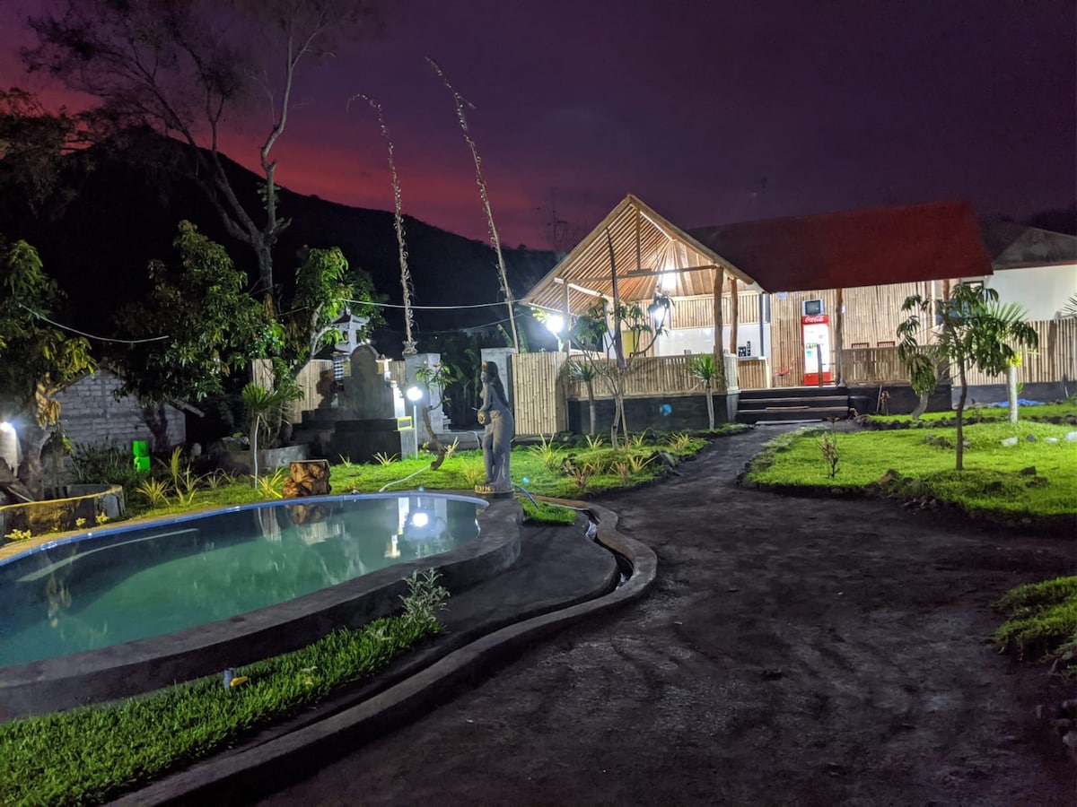 sijaitsee Gunung Batur Kintamanin alueella, joka on vielä mielenkiintoisempi, rakennuksen sijainti on aivan Batur-järven reunalla, joka on Balin suurin järvi, josta on näkymät järvelle ja vuorille sekä edelleen ylläpidetty luonto tekee pysähtymisestäsi unohtumattoman.
