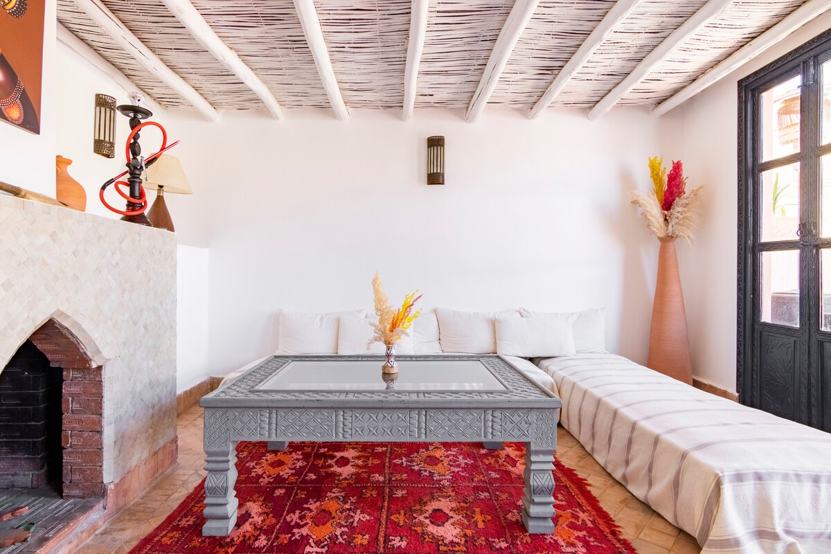 ✨ Majoitu aidossa 3-kerroksisessa riadissa (80 m²) Marrakechin sydämessä. Nauti viehättävästä patiosta, jossa on suihkulähde, keittiö, ruokailutila, pieni oleskelutila, vieraskylpyhuone ja makuuhuone, jossa on oma kylpyhuone pohjakerroksessa. ✨ Yläkerrassa voit rentoutua toisessa makuuhuoneessa, jossa on oma kylpyhuone sekä luku- ja TV-nurkka. Päiväsi ✨ päättyy kattoterassille, joka on järjestetty kesäiseksi oleskelutilaksi ja sopii täydellisesti auringonottoon tai taianomaisiin iltoihin tähtien alla. ✨ Mukavuus, perinne ja marokkolainen vieraanvaraisuus odottavat sinua
