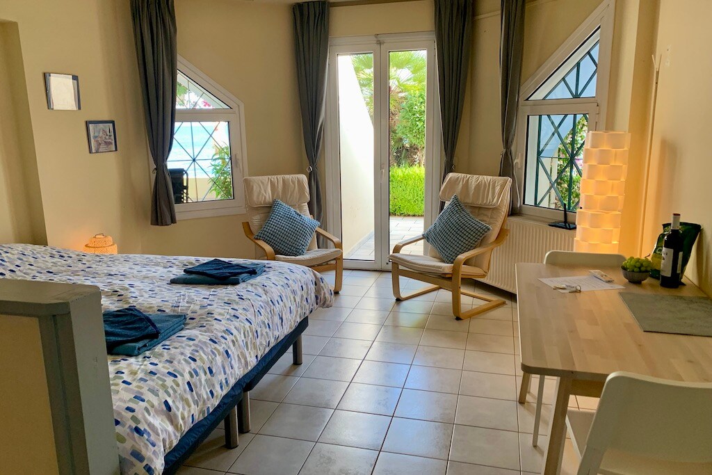 Huoneisto, josta on upeat näkymät Evianlahdelle ja suora pääsy pienelle kiviselle rannalle. Päähuoneessa on parivuode, keittotila ja ruokailutila. Erillisessä huoneessa on kaksi yhden hengen vuodetta, jotka voidaan yhdistää parivuoteeksi. Yksityinen kylpyhuone. Pääsy terassille, jolta on näkymät merelle ja Kreikan mantereen vuorille. Aito kreikkalainen kylä, jossa on ystävälliset naapurit.
