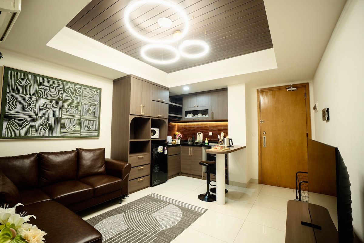 Upouusi 1 makuuhuoneen (ei yksiö) Japandi-tyylinen huoneisto (35 m²), josta on näkymät kaupunkiin ja joka sijaitsee K Mallin yläpuolella Menara Jakartassa, vain 150 m:n tai 5 minuutin kävelymatkan päässä JIExpo Kemayoranista. Keskus-Jakartassa, 11 min JIS:ään, 20 min Grand Indonesiaan ja 5 min maksulliselle tielle. Mukavuuksiin kuuluvat queen-vuode (160 × 200), 2 ilmastointilaitetta, WiFi, keittokomero, 50 tuuman Google TV, vedenlämmittimet ja pesula. Nauti uima-altaasta, kuntosalista, oleskelutilasta, yhteiskäyttötilasta, urheilukentistä ja lasten leikkikentästä. Ihanteellinen 2 vieraalle.