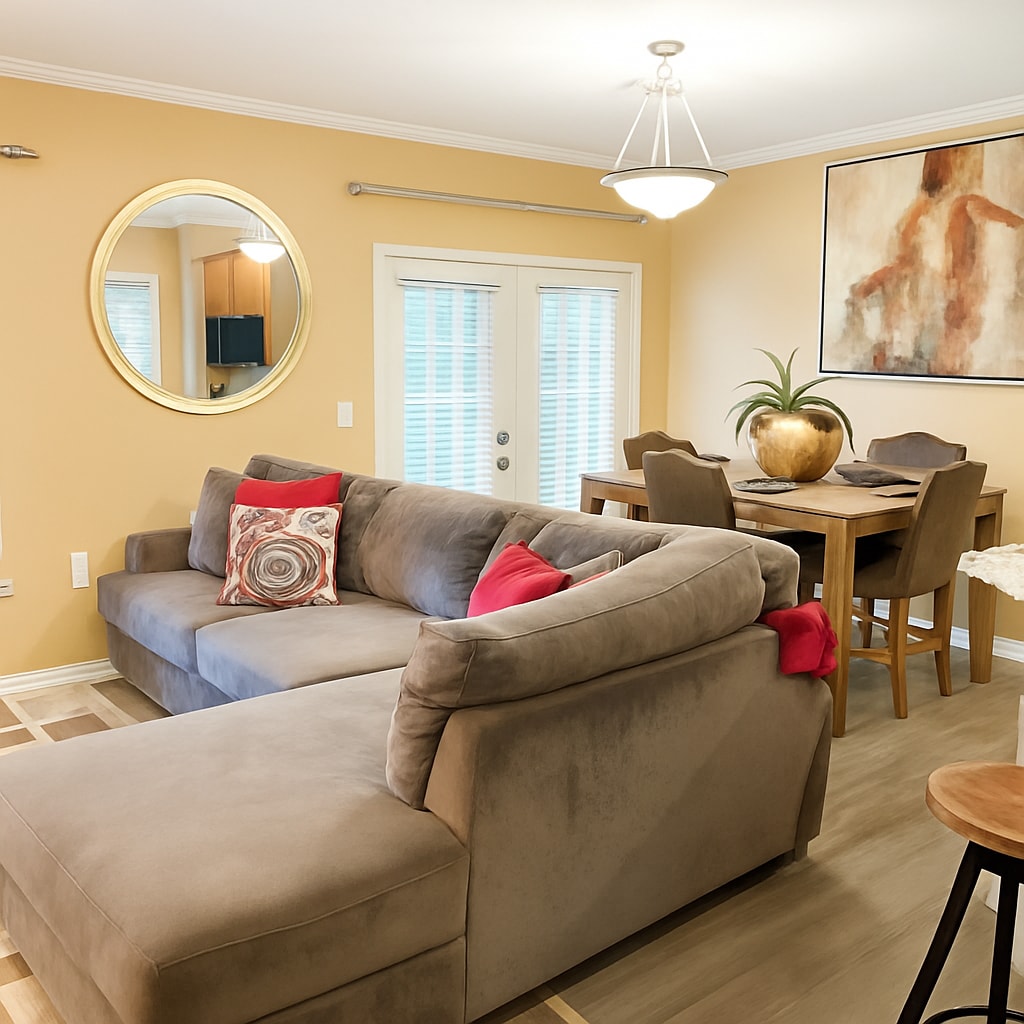 Tervetuloa tilavaan sviittiin*, joka on ihanteellinen perheille tai ryhmille! Nauti king-vuoteesta, kerrossängyistä ja mukavasta sohvasta. Sviitissä on kaksi televisiota, moderni kylpyhuone, jossa on suihkualue, ja hyvin varusteltu keittokomero, jossa on mikroaaltouuni, kahvinkeitin ja välttämättömät ruokailuvälineet. Rentoudu mukavassa oleskelutilassa tai nauti ateriasta pienessä ruokailutilassa. Sijaitsee rauhallisella alueella, lähellä paikallisia nähtävyyksiä, ruokapaikkoja ja ostosmahdollisuuksia. Varaa majoituksesi nyt! *Katso kohteen kuvaus
