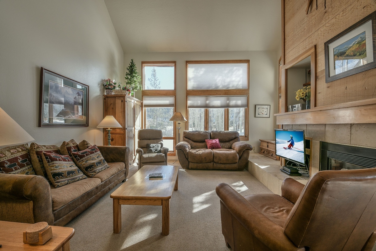 Majoitu tässä piilotetussa helmessä, joka sijaitsee joen vieressä, ja 2 minuutin kävelymatkan päässä Keystonen rinteiltä (erityisesti Mountain House Base Area, jolta pääsee Perun hissiin). Helppo pääsy Snake River Bike Pathille ja kävelymatka River Run Villageen, jossa kaikki kesäfestivaalit ovat! Tilava olohuone, iso ruokailutila, täysin varustettu keittiö, terassi, josta on näkymät vuorille ja joelle! Vierailla on pääsy sisätilojen porealtaaseen. Lupanumero: STR21-01361. Pysäköintilippu kahdelle ajoneuvolle rakennuksen ulkopuolella.