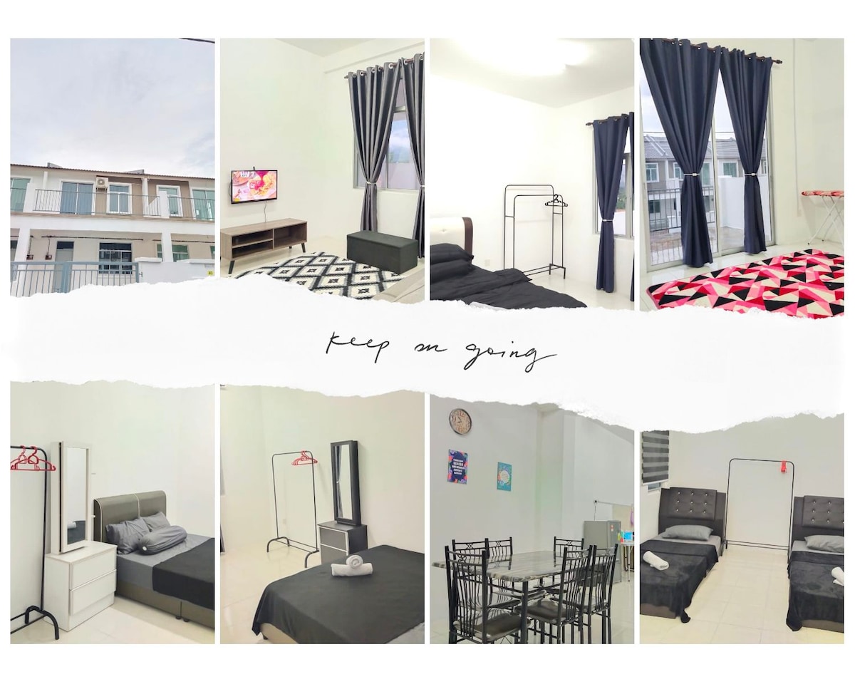 Double Storey House that is equipped with 4 rooms, 5 Queen beds & 3 bathrooms, able to accommodate 10+ pax guests. (5 EXTRA single mattresses can be provided upon request with charges) The car porch can fit 2 cars. Suitable for family trip, business trip & friend gathering. Strategic location that near to North-South Highway (10min drive), Tambun Lost World (9min drive) and around 20 min to reach Ipoh Old Town area. Convenience with restaurant, cafe, 99speedmart, Econsave supermarket, and etc.
