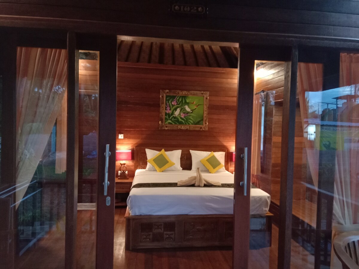Perinteinen balilaisen puun bungalow, sisustettu maulla. 24 m2: n huoneessa on erittäin mukava 180 x 200 vuodetta, kirjoituspöytä ja suuri vaatekaappi. Huoneistossa on suuri suihku, jossa on lämmintä vettä, wc-istuin ja suuri pesuallas, jossa on peili. Aamiainen sisältyy hintaan ja tarjoillaan joka aamu klo 8-11 toiveidenne mukaan. Voit valita leivästä, vegaanipannukakuista, munista tai kotitekoisesta smoothie-kulhosta.