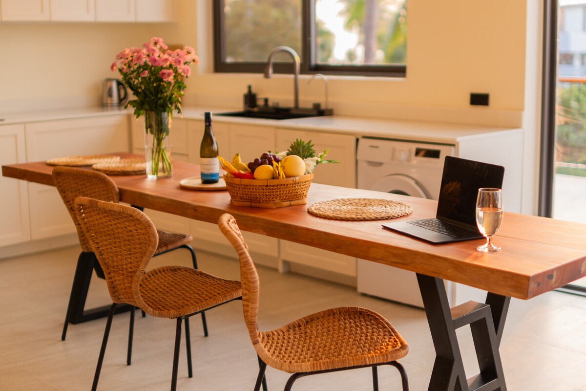 Tyylikäs yksityinen uima-allasvilla Koh Phanganissa Koe trooppista eleganssia tässä upouudessa 2 makuuhuoneen huvilassa, joka on suunniteltu yksityisyyttä, mukavuutta ja rentoutumista varten. Tämä moderni lomakohde sijaitsee rauhallisessa kookospalmun metsässä, ja siellä on seuraavat ominaisuudet: ✨ Yksityinen uima-allas ja aurinkotuolit 🛏️ 2 tilavaa makuuhuonetta, joissa on king-vuoteet 🛋️ Avoin oleskelutila, jossa on mukava sohva ja älytelevisio 🍽️ Täysin varustettu keittiö, jossa on baari-istumapaikkoja 🌿 Ulkoruokailuterassi 🌴 Ympäröivät vehreät maisemat ja bambuaidat