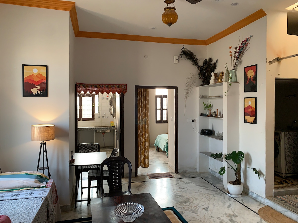 Jharoka on viehättävä vaaleanpunainen 1 BHK vain 500 m päässä Fateh Sagar -järveltä. Nauti kodikkaasta salista, jossa on Android TV ja pelejä, täysin varustellusta keittiöstä ja rauhallisesta parvekkeesta, jota ympäröi vehreys. Tämä kohde on suunniteltu tyylikkäillä radžastanilaisilla jharoka-yksityiskohdilla, ja se tarjoaa mukavuutta, yksityisyyttä ja rauhallisen majoituksen lähellä Udaipurin järvenrantapaikkoja. Huomaa, että huoneisto on toisessa kerroksessa, eikä siellä ole hissiä, mutta talonmies auttaa matkatavaroiden kanssa.