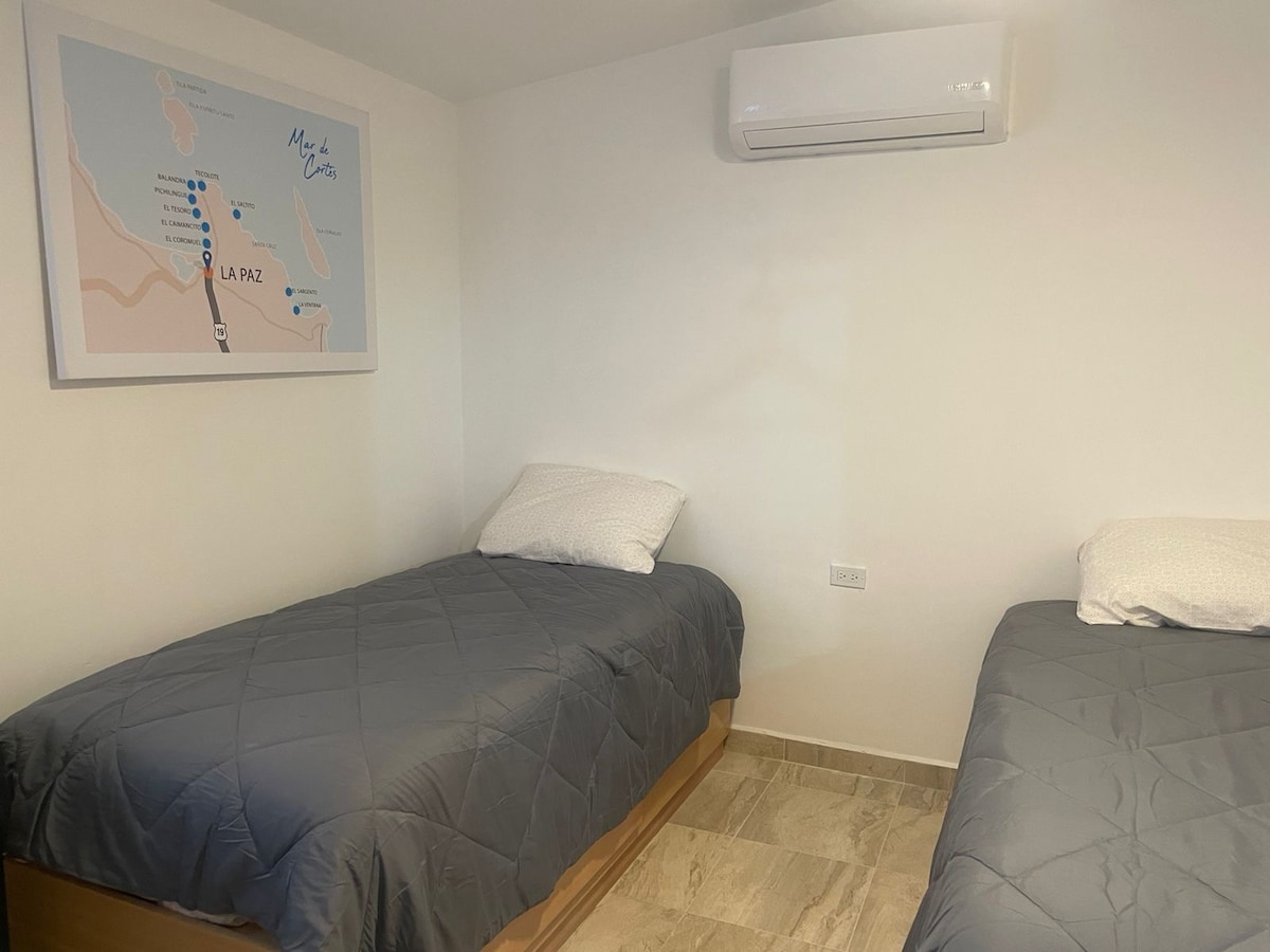 🌴 El Esterito, La Paz BCS – Habitación Privada Moderna 🌴 Situada a solo 4 cuadras del Malecón, en la mejor zona de La Paz, esta casa de huéspedes te permite descubrir deliciosos restaurantes y disfrutar de las vistas más impresionantes del mar y los atardeceres. El barrio El Esterito combina tradición pesquera y ambiente local, ideal para vivir una experiencia auténtica.