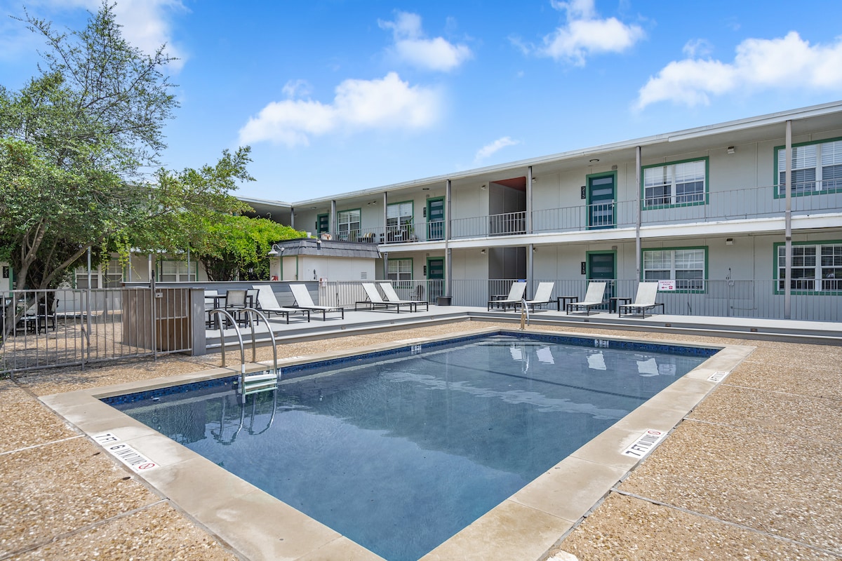 Pakene arjesta hiljaiseen Austinin keskustan kolkkaan tilaan ja hiljattain kunnostettuun huoneistoon, joka sijaitsee hiljaisessa, matalassa rakennuksessa. Kohokohdista löytyy *yksi ilmainen aidattu/varattu pysäköintipaikka*, *kaksi ilmaista polkupyörää*, huippuluokan kodinkoneet, yksityinen ulkoterassi ja mukava makuuhuone, jossa on king-vuode. Queen-vuodesohvan ansiosta tässä huoneistossa voi nukkua neljä. Kylpyhuoneeseen pääsee makuuhuoneesta ja olohuoneesta, mikä pitää makuuhuoneen yksityisenä. Kaksi suurta älytelevisiota ovat valmiita suoratoistoon. Majoitu, rentoudu ja nauti!
