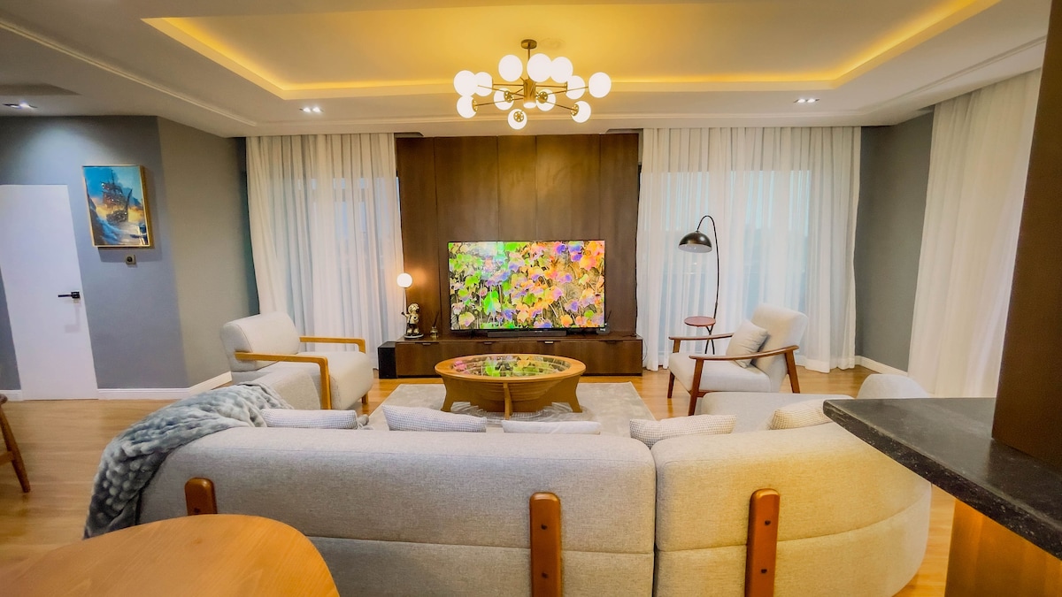 Rentoudu viihtyisässä, minimalistisessa yhden makuuhuoneen kolmannen kerroksen huoneistossamme, joka tuntuu kodilta (mutta ilman askareita). 🧼 Päivittäinen siivous ja raikkaat pyyhkeet pyynnöstä ☕️ Aamiaispalkki (tarjolla ilmainen valikoima teetä ja keksejä) 🚿 Kuuma vesi ja luotettava sähkö (ympäri vuorokauden) 🍳 Täysin varusteltu keittiö, jossa on laadukkaat kodinkoneet 📺 55-tuumainen älytelevisio Netflixillä 🌐 Nopea Wi-Fi 🏙️ Kattoterassi 🏋 Kuntosali ❄️ Ilmastointi 🚗 Ilmainen pysäköinti paikan päällä 🔐 Ympärivuorokautinen turvallisuus 🛋️ Monen tavan vuodesohva
