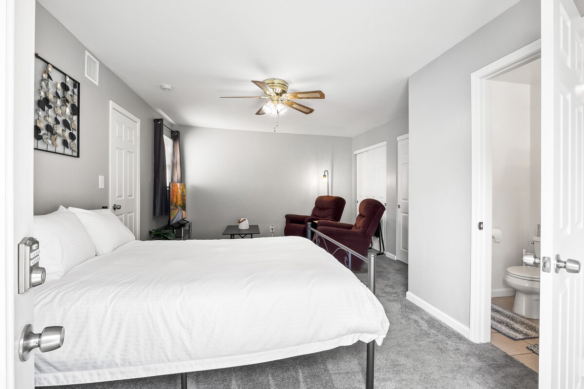 Yksityinen, tilava yksiö rauhallisella ja turvallisella alueella. Sisältää king-vuoteen, yksityisen kylpyhuoneen, jossa on amme, täysin varustetun keittiön, ruokailutilan ja oman sisäänkäynnin. Nauti suuresta älytelevisiosta, nopeasta wifistä, pesukoneesta/kuivausrummusta ja työpöydästä. Herää rauhalliseen takapihaan, jossa ruoho on juuri leikattu. Ilmainen yksityinen pysäköinti sisältyy hintaan. Vain 5 minuutin päässä ruokakaupoista, ravintoloista ja välttämättömyystarvikkeista – täydellinen pitkäaikaisiin majoituksiin.