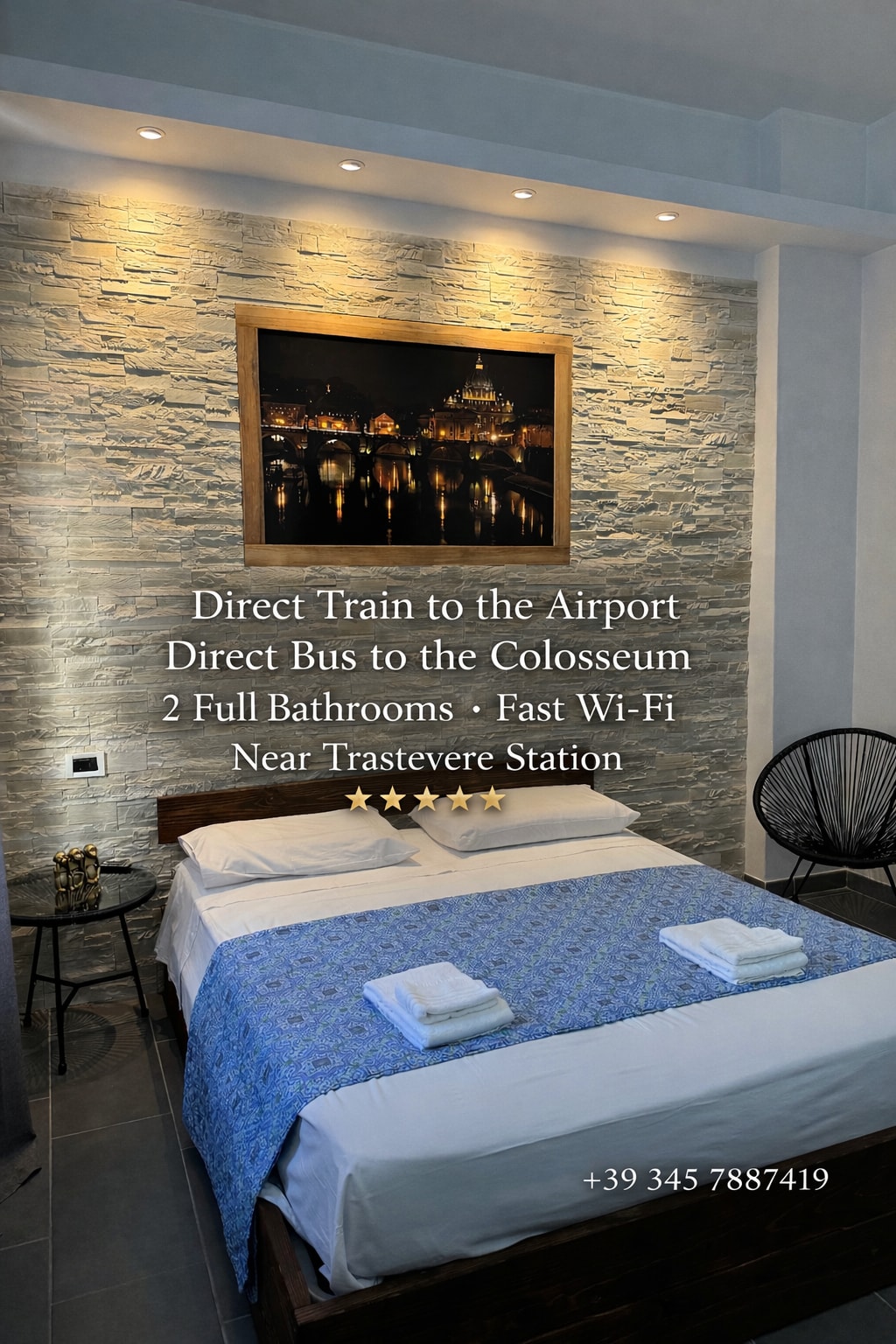 CASA REBY on huoneisto, jossa on tyylikäs sisustus ja hienostunut nykyaikainen tyyli sekä upea terassi. Se sijaitsee eksklusiivisimmassa rakennuksessa vain muutaman minuutin kävelymatkan päässä Rooman historiallisesta keskustasta. Siinä on kaikki mukavuudet jopa 4 hengelle, ja se on täydellisesti yhteydessä juna-, bussi- ja raitiovaunuliikenteeseen. Ensimmäisestä hetkestä lähtien, kun astut trooppisen puutarhan inspiroimaan aulaan, arvostat sitä, että olet ainutlaatuisessa paikassa Trasteveren vieressä.