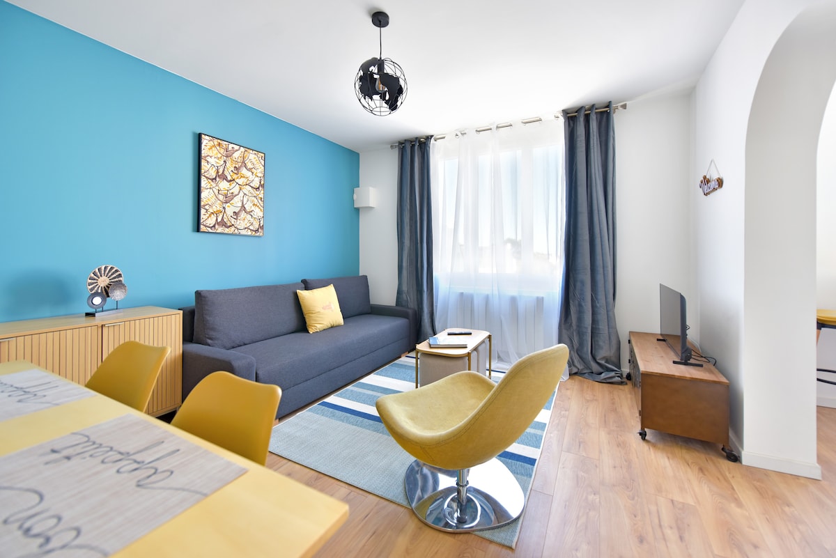 Upea huoneisto Croisicin salmen edessä viehättävässä vanhassa talossa, helppo saavutettavuus (TGV-asema 5 minuutin kävelymatka ja suuri ilmainen pysäköintialue 2 minuutin päässä). Upea näkymä 2 suuren ikkunan ja pieni parveke (kaksinkertaiset ikkunat) ansiosta. Suuri asunto (65 m2) Suuri olohuone, jossa on integroitu keittiö 20 m2 makuuhuone, jossa on king-size-vuode ja vuodesohva, erillinen toimisto online-työskentelyä varten. WiFi ja televisio. Kylpyhuone, jossa on suuri suihku. Paljon säilytystilaa.