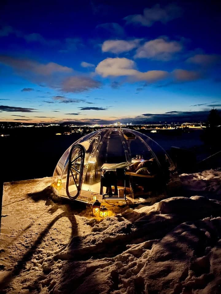 Helmi Hammervatnetissä kukkulalla. Mahtava kokemus kahdelle henkilölle. Kupoli on 23 m2, ja ikkunat ovat taivaalla ja edessä. Katso tähtiä ja kauempana vedestä vuoteesta. Kupoli seisoo 70 m2: n huoneistossa, jonka yläpuolella on veden yläpuolella oleva vene ja nuotiopaikka. Kupolissa on myös wc-huone. Hammervatnet tarjoaa fantastista kalastusta ympäri vuoden, ja meillä on veneitä ja välineitä kalastukseen sekä veneestä, maalta että jäästä käsin. Jos tämä kiinnostaa sinua majoittumisesi aikana, ilmoita meille asiasta.