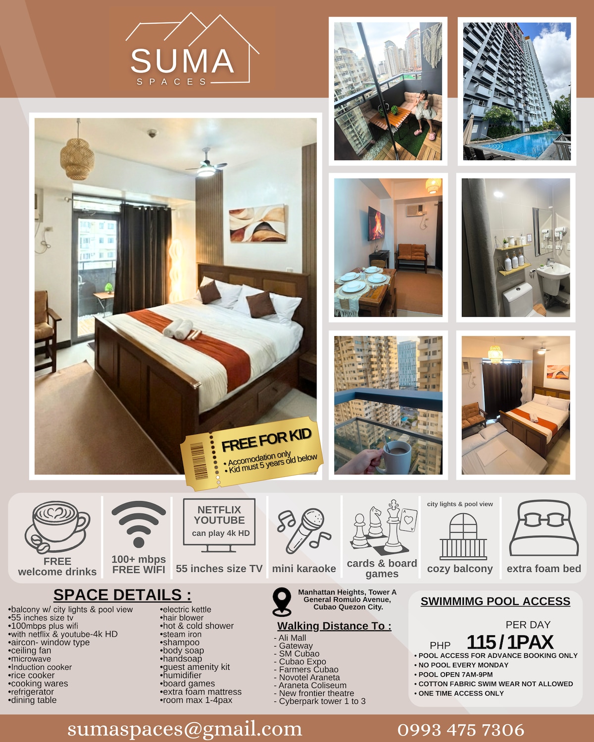Valmistaudu miellyttävään majoittumiseen äskettäin remontoidussa ja päivitetyssä viihtyisässä yksiössä, josta on näkymä kaupunkiin Eastwood LeGrand Tower 3:ssa, Eastwood Cityssä, Libisissä, jossa on valokuituinternet ja ILMAINEN PÄÄSY Netflixiin, Primeen jne. LISÄKSI - Ilmainen pääsy huoneiston laajaan uima-altaaseen ja muihin huippuluokan mukavuuksiin, kuten pelihuoneeseen, joogahuoneeseen, leikkihuoneeseen ja lasten leikkipaikalle, jossa on niin paljon ravintoloita ja paljon muuta - täydellinen elämys perheelle, ystäville tai rakkaimmille!