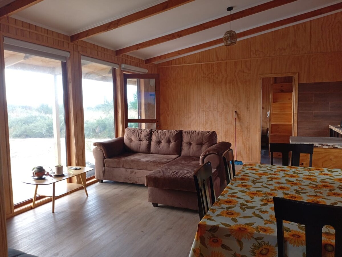 Viihtyisä mökki, jossa on makuuhuone, keittiö-ruokailuhuone ja siisti kylpyhuone, jossa on lämmintä vettä. Se sijaitsee sisämeren rannalla, 15 minuutin päässä Chacaosta ja 30 minuutin päässä Ancudista. Meri näkyy kaikista ikkunoista, ja ranta on 100 metrin päässä. Sen lämmittämiseen ON KAASULIESI. Ihanteellinen tila pariskunnille, jotka haluavat levätä kauniissa, luonnollisessa ja täysin itsenäisessä ympäristössä. Vuodesohvalla voi maata lapsi. Siellä on WiFi ja normaali yhteys.