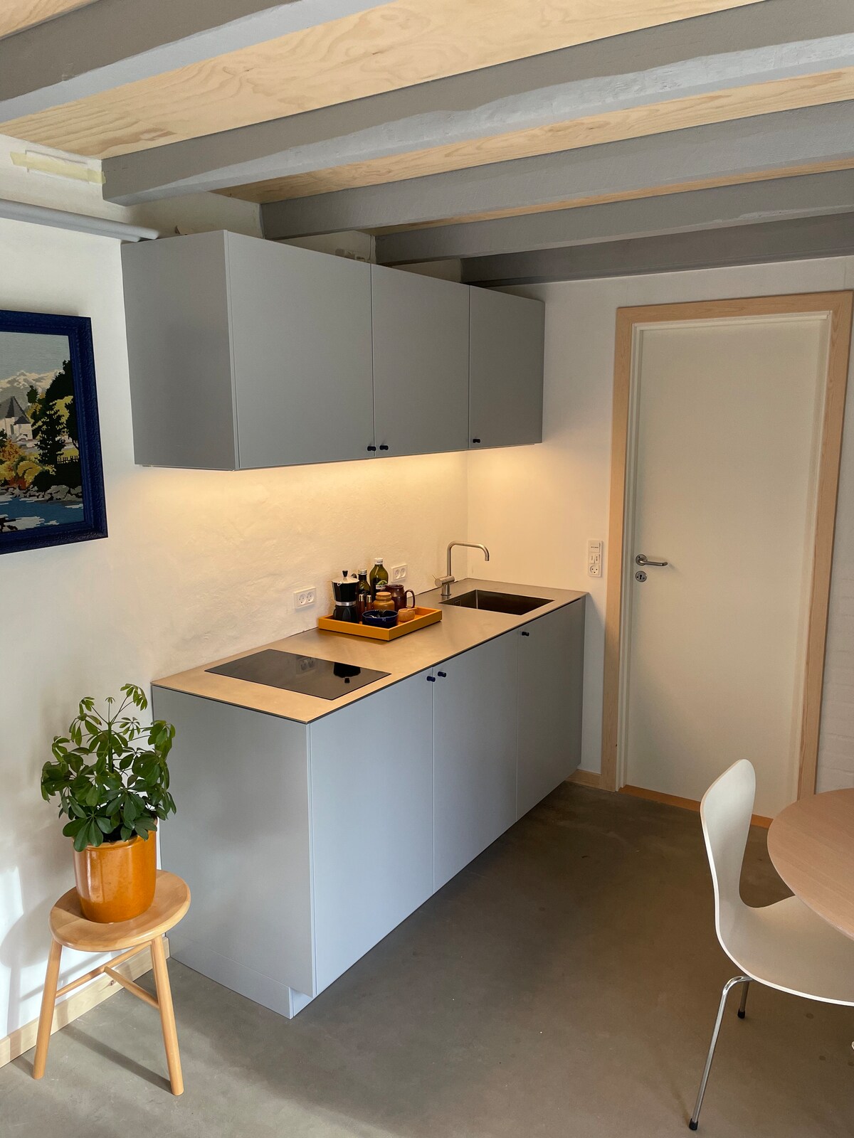mukava, uudempi puumökki, jossa on keittiö, jossa on jääkaappi, mikroaaltouuni ja keittolevy, sähköinen miniuuni. Lattialämmitys mökissä. Wc, suihku 30 litran kuumavesisäiliöllä (lyhyt suihku) Parivuode, sohva, ruokapöytä, pieni terassi. TV ja wifi. Mökki sijaitsee puutarhassa lähellä taloamme. Asumme Hjortshøjin kylän ulkopuolella metsän reunalla ja lähellä valtatietä. Koirat ovat tervetulleita. Vuokrattu vuodevaatteiden ja pyyhkeiden kanssa. Etäisyys Århusiin 12 km, pois. kuljetus 600 m. Mökki ei sovellu pitkäaikaisiin majoittumisiin.