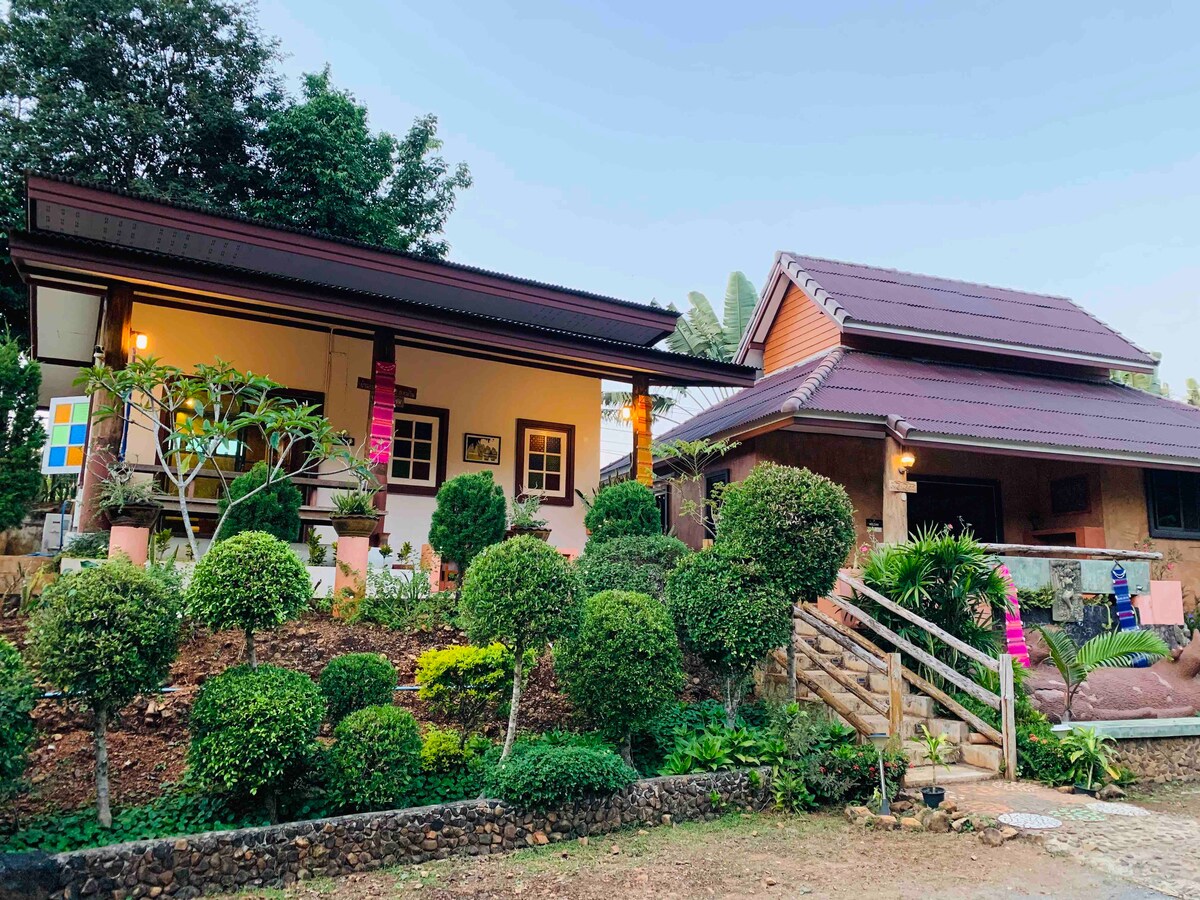 meidän bungalow on bambutaloja, majat on perinteisiä ruohonjuuret. lähellä Karenin kukkulan heimon kylää, näkymät viidakkoon, simpukka ja rauhallinen retkeily - alue, jota ympäröivät vesiputous,joki ja vuori. talo sopii pariskunnille tai ystäville, joilla on gueen-size-vuode, ja voit lisätä 2 lisävuodetta perheelle. voit varata päiväretkiä ja majoittua yön yli.