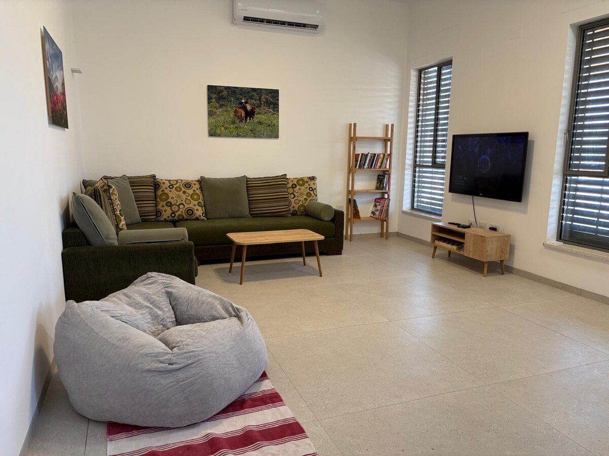 Talomme (80 m²) sijaitsee hiljaisessa maanviljelijäyhteisössä Golanin kukkuloilla. It is a single rustic house, with a apartment protected space (mmd). Talossa on kaksi tilavaa makuuhuonetta, täysin varustettu keittiö, valoisa olohuone ja suuri parveke, jolta on näköala. Se sopii pariskunnille tai perheelle, jossa on enintään kaksi lasta. Tarjoamme kaikki tarvittavat liinavaatteet ja pyyhkeet mukavuutesi ja tarpeisiisi. Asumme muutaman minuutin kävelymatkan päässä, joten olemme valmiita auttamaan kaikissa ongelmissa.