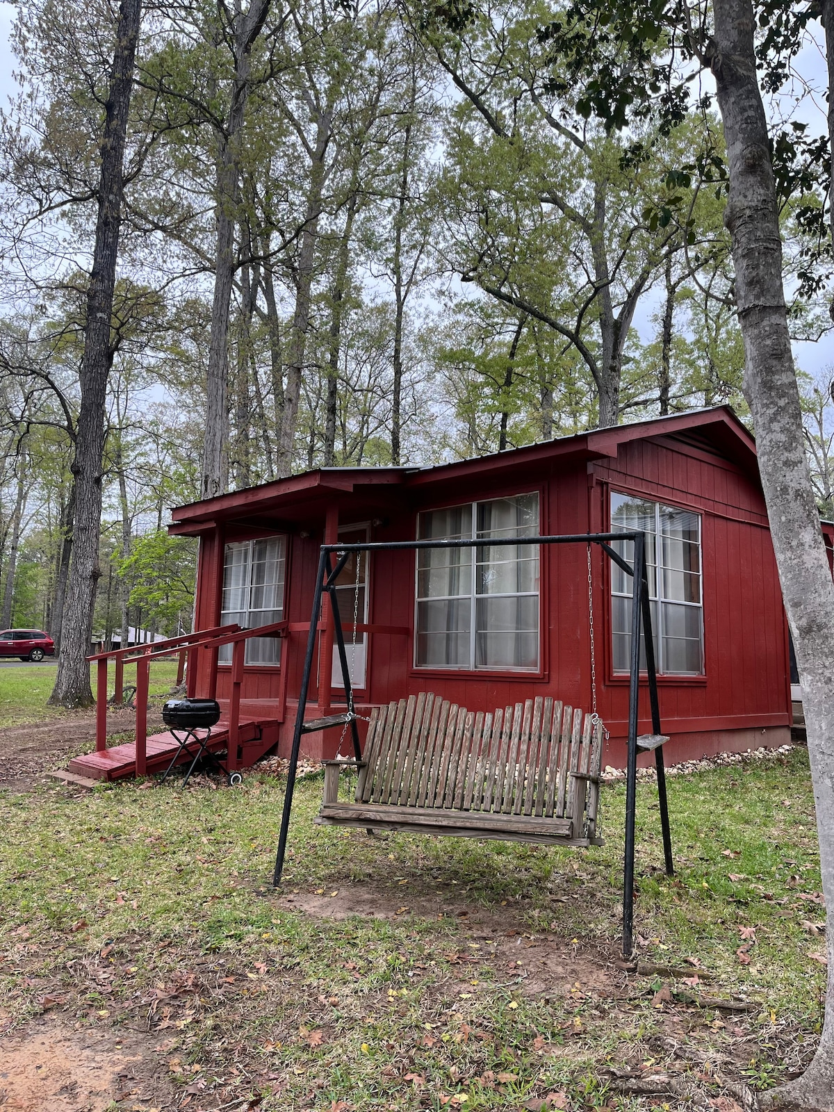 Sit back and relax in this 1 room stylish cedar cabin. Sip coffee on the covered porch and take in the beautiful sunrise from your lakefront view surrounded by Sabine National Forest. Keep an eye out for Bald Eagles. Explore nearby coves from our kayaks, jump in the lake from our swimming platform, fish from our piers, or lounge by the campfire. Toledo Bend Lake, one of the premier bass fishing lakes in the country, and we have the best crappie fishing right below our marina just steps away.