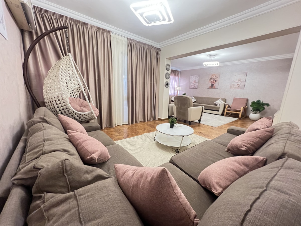 Koe rentouttava loma suuressa huoneistossa, jossa on 2 makuuhuonetta (king-size-vuode ja 2 yhden hengen vuodetta) ja 2 kylpyhuonetta, joista toinen on suuri ja siinä on lämminvesiallas, sekä suuri olohuone, jossa on älykäs Samsung-televisio, ruokapöytäalue, suuri keittiö ja kaikki tarvitsemasi mukavuudet. Upea maisemanäkymä puutarhaan ja rauhallinen... Ilmainen pysäköintialue koko päivän ja hissi yksikköön. Korttipelit myös tarjolla. 3 minuutin kävelymatkan päässä on koko katu ravintoloita, kahviloita, juomakauppoja. nauti täällä