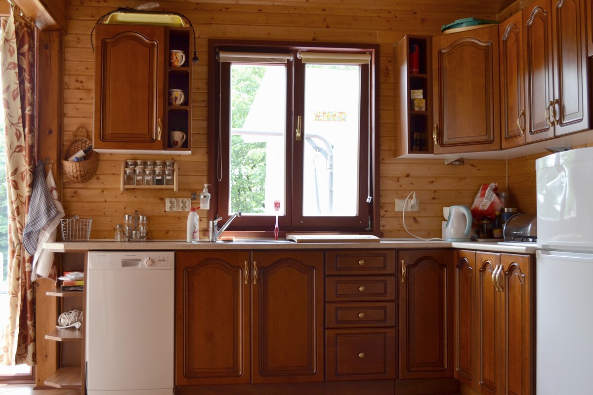 Kaksikerroksinen talo, jossa on terassi, puutarha ja upeat luonnonnäkymät. 4 makuuhuonetta, 3 kylpyhuonetta, 2 keittiötä ja tilava olohuone, jossa on takka. Kaikki on uutta ja toiminnallisesti kalustettua. Puutarhassa on nurmikko, metsä, takka, grilli, lepotuolit, riippumattoja ja keinu. Täydellinen paikka perheelle tai ystäville paeta kaupungin hälinää. Ei naapureita välittömällä rajalla. Lähistöllä on metsää, järviä, pyöräilyreittejä ja melontareittejä. Suuret juhlat eivät ole sallittuja.