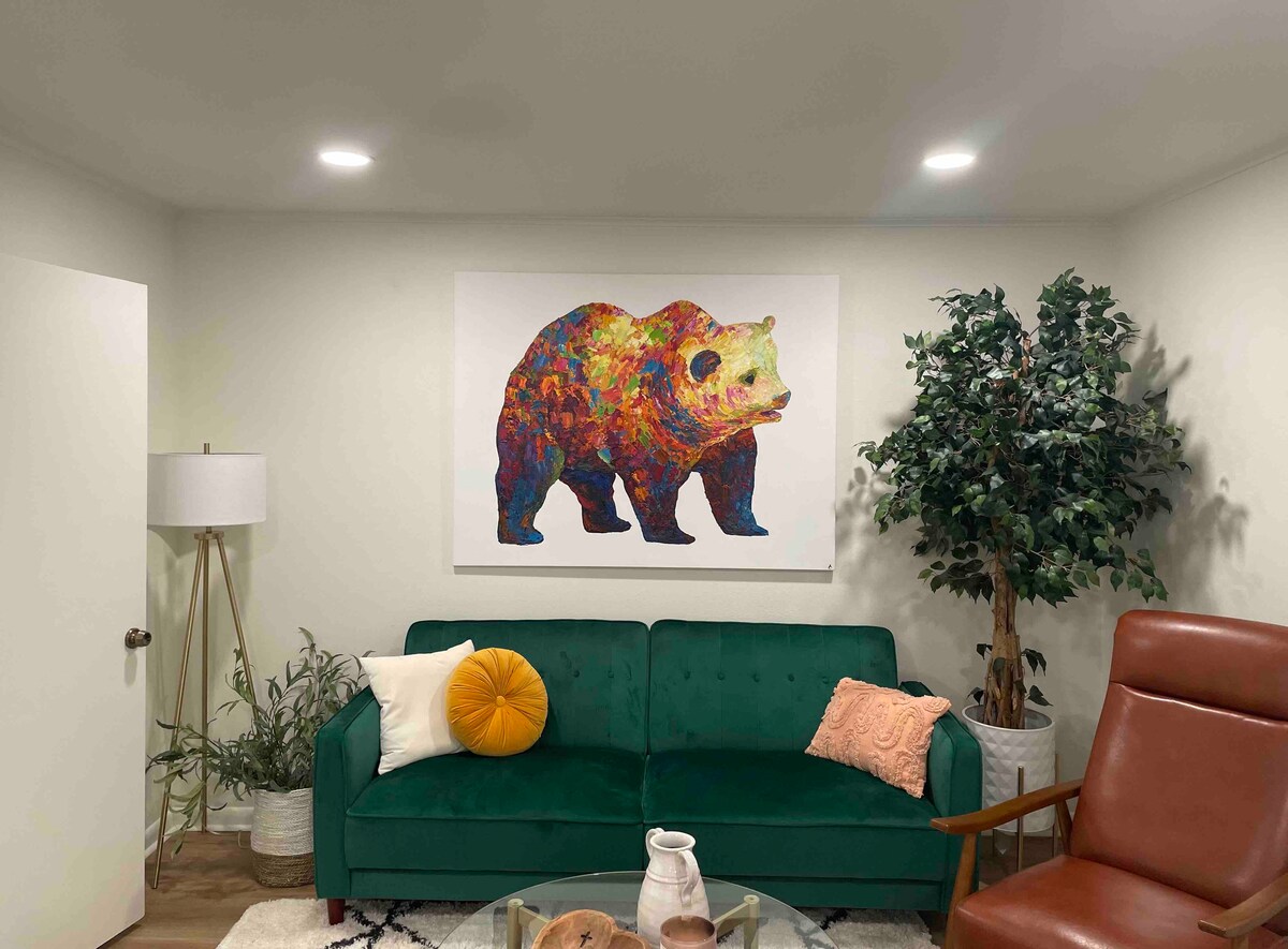 Todellinen pakopaikka vain muutaman minuutin päässä Wacon keskustasta. Yksityisestä sisäänkäynnistäsi pääset koko talon yläkerran alueelle! Olo-/pelihuoneessa, jossa on keittokomero, on SmartTV, pöytäjalkapallo, ilmakiekko ja pingis. Nauti kahden tilavan kuistin rauhallisuudesta. Sytytä takka tai tulisija tai kokkaa kaasugrillillä. Et majoitu Nick Sabanin luona, joten nauti kohteesta! Majoittajat ovat lähellä, mutta eivät alueellasi. Lue aiemmat arvostelut ja varaa tämä Wacon helmi!