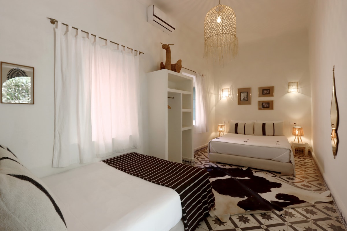 Majoitu viehättävässä riadissa Marrakeshin medinan sydämessä! Riadissamme on 5 autenttista huonetta, joissa on kussakin oma kylpyhuone. Tämä kohde on vain yksi huone, ja voit valita suosikkisi saapuessasi. Nauti ainutlaatuisesta marokkolaisen perinteen ja modernin mukavuuden sekoituksesta, joka sopii täydellisesti pariskunnille, yksin matkustaville tai ystäville. Vain muutaman askeleen päässä soukeista, monumenteista ja paikallisista ravintoloista se on ihanteellinen tukikohta unohtumattomalle Marrakeshin kokemukselle.